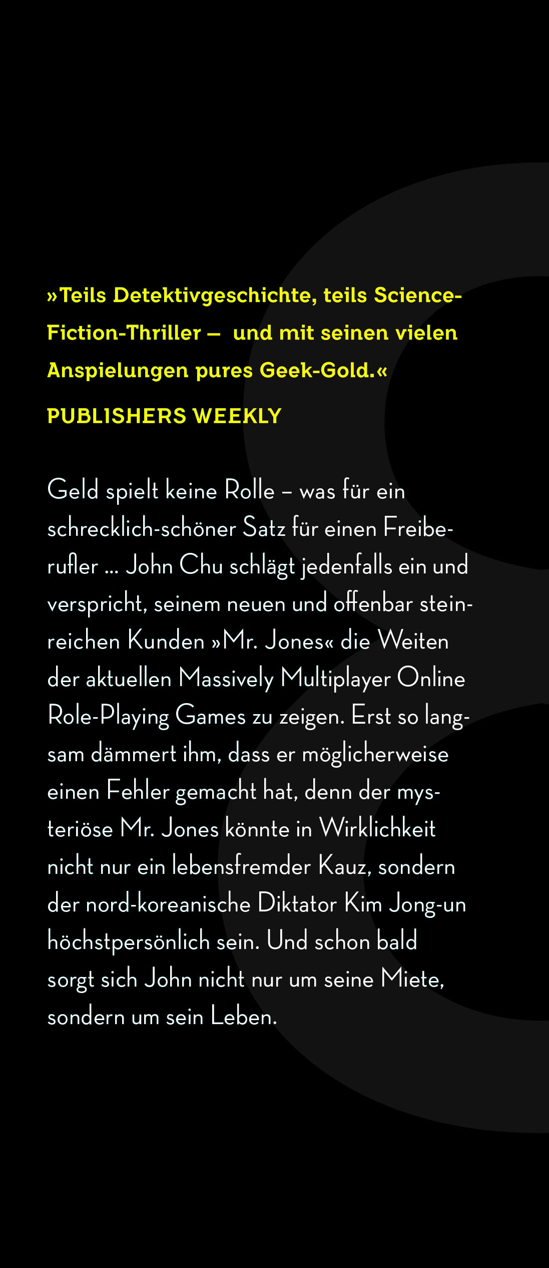 Das Geschäft brummt, und John würde sich als glücklich bezeichnen, wären da nicht zwei klitzekleine Probleme: Zum einen hat seine Ex-Freundin nach einer unglücklich verlaufenen Trennung geschworen, seine berufliche und private Existenz zu vernichten. Zum anderen vermutet er, dass es sich bei seinem neuesten Kunden in Wirklichkeit um den nordkoreanischen Diktator Kim Jong-un handelt, der die virtuelle Welt studieren möchte, um sie für seine politischen Zwecke zu instrumentalisieren.