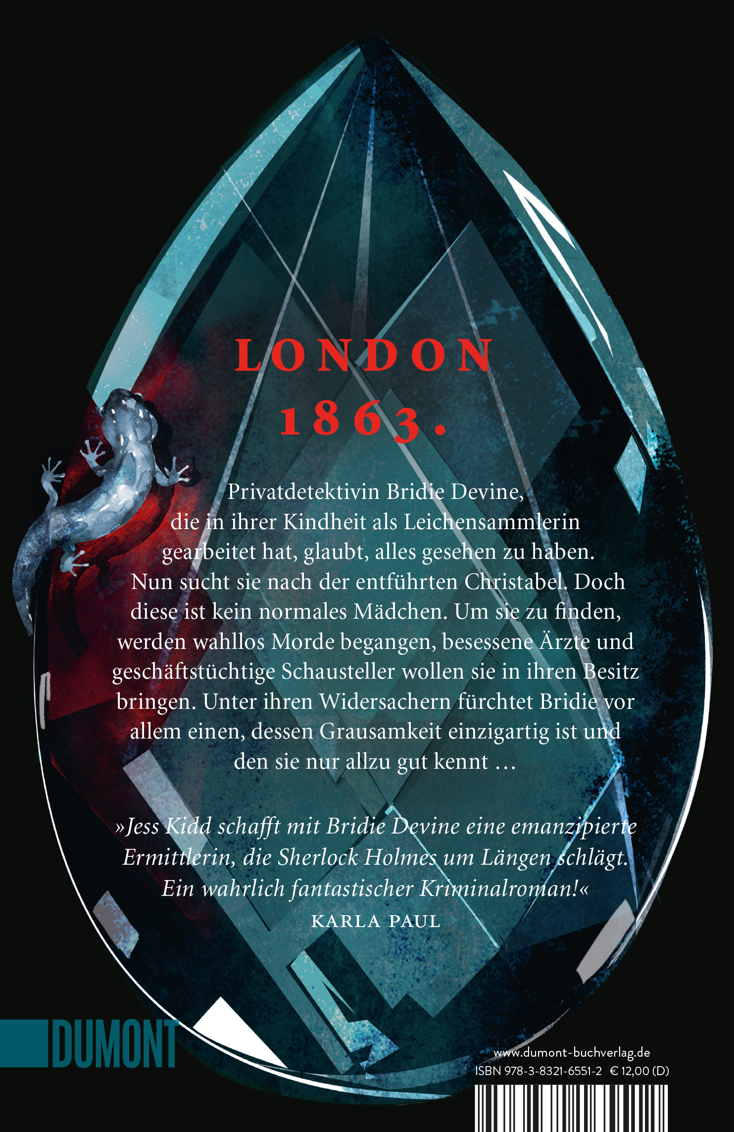 JESS KIDD, 1973 in London geboren, hat Literatur an der St. Mary’s University in Twickenham studiert. Bei DuMont erschienen 2017 ihr Debütroman ›Der Freund der Toten‹, der auf der Krimibestenliste stand, sowie 2018 und 2019 die Romane ›Heilige und andere Tote‹ und ›Die Ewigkeit in einem Glas‹. Die Autorin lebt mit ihrer Tochter in West London.