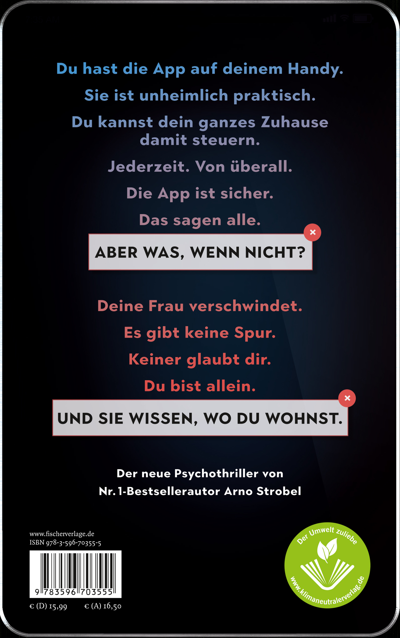 Du hast die App auf deinem Handy. Sie macht dein Zuhause sicherer. Doch nicht nur die App weiß, wo du wohnst ... Der neue Psycho-Thriller von Nr. 1-Bestseller-Autor Arno Strobel. Brandaktuelles Thema »Smart Home« – Wenn der Wunsch nach Sicherheit im eigenen Zuhause zur tödlichen Falle wird ...