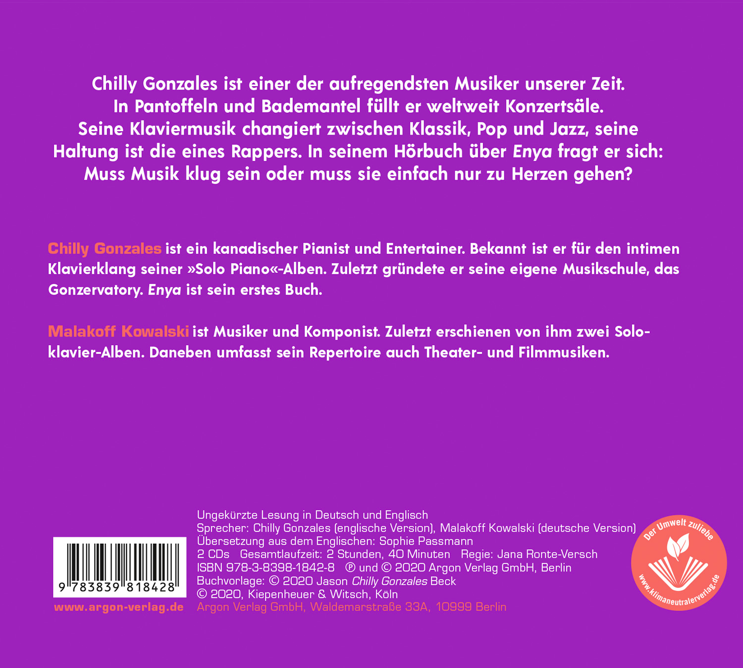 Chilly Gonzales ist einer der aufregendsten Musiker unserer Zeit. In Pantoffeln und Bademantel füllt er weltweit Hallen. Sein Klavierspiel changiert zwischen Neoklassik und Jazz, seine Haltung ist die eines Rappers. In seinem Hörbuch über Enya fragt er sich: Muss Musik klug sein oder muss sie einfach nur zu Herzen gehen? Enya, die Frau mit der Engelsstimme und den unzählbaren Goldenen Platten, mag manche schmunzeln lassen, Chilly Gonzales jedoch ist begeistert von dieser sanften Musik und der mysteriösen Musikerin.