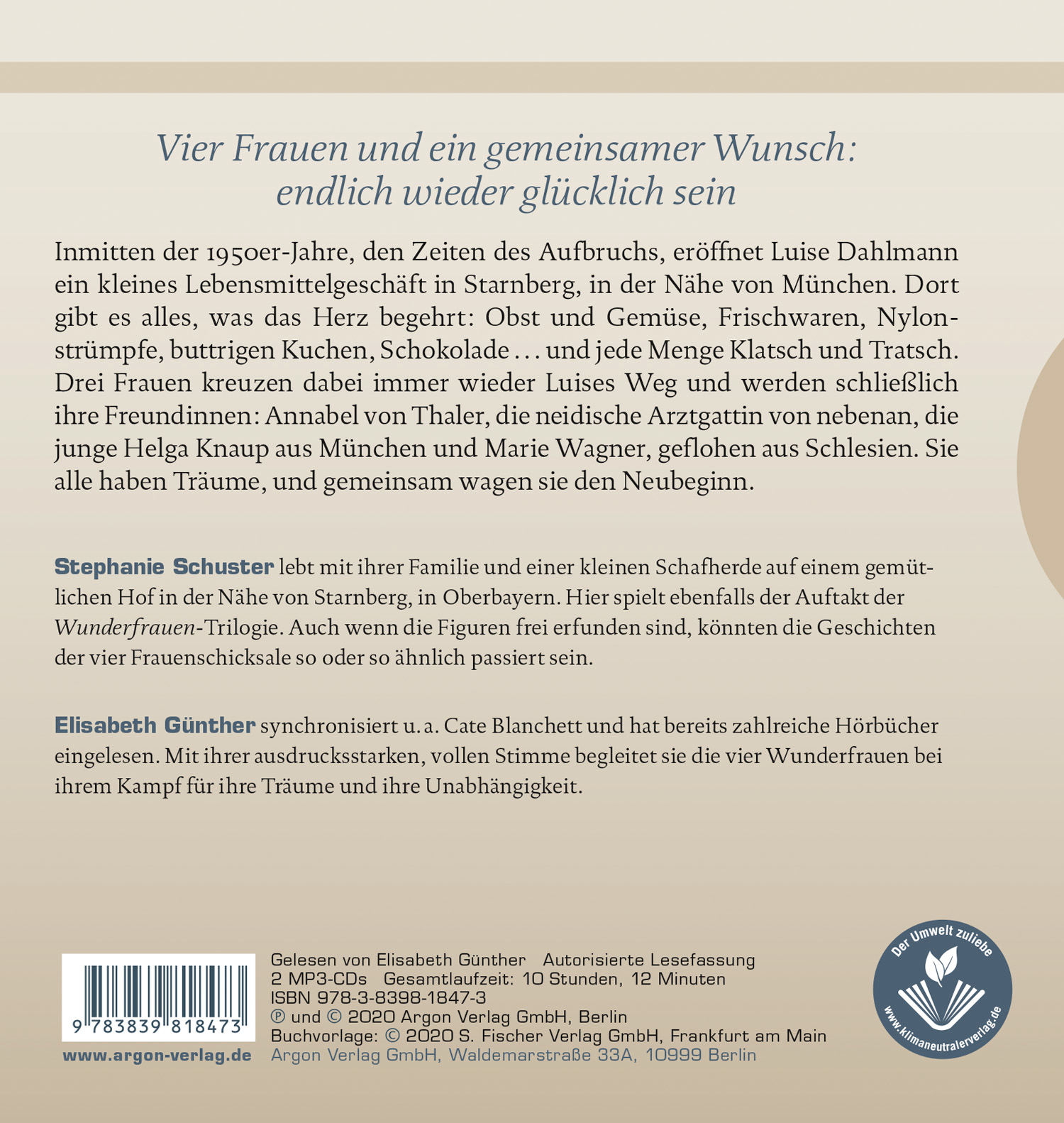 Band 1 einer lebendigen Trilogie, die den Alltag der Bundesrepublik in den 1950er- bis 1970er-Jahren porträtiert. Vier starke Frauen zwischen Wirtschaftswunder und Hippiezeit, zwischen Nylons und Emanzipation, zwischen Liebe und Freundschaft und mit einem gemeinsamen Wunsch: Endlich wieder glücklich sein. Elisabeth Günther synchronisiert unter anderem Cate Blanchett und hat bereits zahlreiche Hörbücher eingelesen. Mit ihrer ausdrucksstarken, vollen Stimme begleitet sie nun die vier Wunderfrauen bei ihrem Kampf für ihre Träume und ihre Unabhängigkeit.