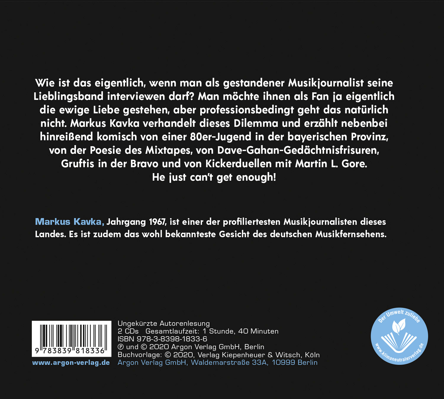 Wie ist das eigentlich, wenn man als gestandener Musikjournalist seine Lieblingsband interviewen darf? Man möchte als Fan ja eigentlich die ewige, unsterbliche, immerwährende Liebe gestehen, aber professionsbedingt geht das natürlich nicht. Markus Kavka ist so ein Musikjournalist und zugleich Hardcore-Fan der Superstars Depeche Mode. In diesem Hörbuch verhandelt er dieses Dilemma und andere und erzählt nebenbei hinreißend komisch von einer Jugend in der bayerischen Provinz in den Achtzigern, von der Poesie des Mixtapes, von Dave-Gahan-Gedächtnisfrisuren, Gruftis in der Bravo und von Kickerduellen mit Martin L. Gore. He just can't get enough!