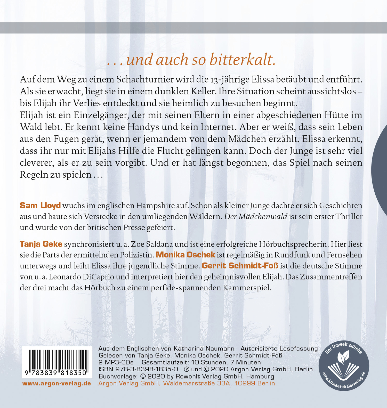 Tanja Geke als Polizistin, Monika Oschek als Elissa und die jugendliche Stimme von Gerrit Schmidt-Foß als Elijah werden das Hörbuch zu einem perfide-spannenden Kammerspiel machen, dem sich kein Hörer entziehen kann.