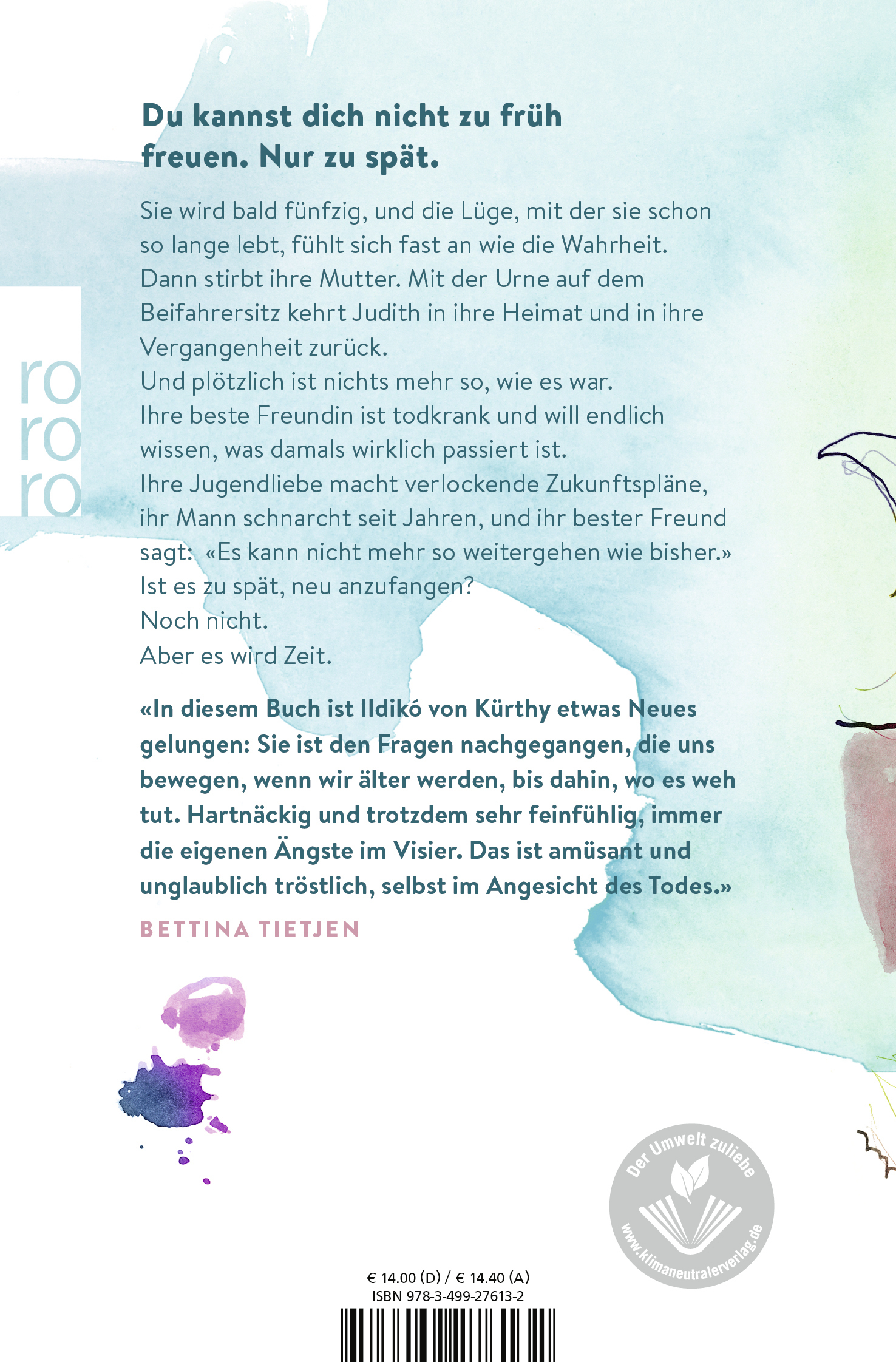 In diesem Buch ist Ildikó von Kürthy etwas Neues gelungen: Sie ist den Fragen nachgegangen, die uns bewegen, wenn wir älter werden, bis dahin, wo es weh tut. Hartnäckig und trotzdem sehr feinfühlig, immer die eigenen Ängste im Visier. Das ist amüsant und unglaublich tröstlich, selbst im Angesicht des Todes. (Bettina Tietjen)