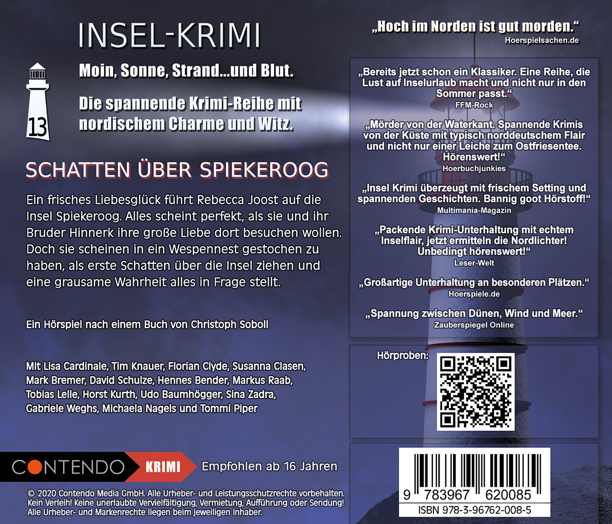 Ein frisches Liebesglück führt Rebecca Joost auf die Insel Spiekeroog. Alles scheint perfekt, als sie und ihr Bruder Hinnerk ihre große Liebe dort besuchen wollen. Doch sie scheinen in ein Wespennest gestochen zu haben, als erste Schatten über die Insel ziehen und eine grausame Wahrheit alles in Frage stellt.Lassen Sie sich fesseln vom norddeutschen Charme, frechem Humor, bekannten Synchronstimmen, orchestralem Soundtrack und realistischen Sounds. Ein einmaliges Hörspiel-Erlebnis in seiner schönsten Form!- Sprecher: Rebecca Joost - Lisa Cardinale, Hinnerk Joost - Tim Knauer, Mathis Petersen - Florian Clyde, Theo Klaasen - David Schulze, Dorothea Olsen - Susanna Clasen, Jörg Hagen - Mark Bremer, Pirat - Markus Raab, Papagei - Tobias Lelle, Tina - Sina Zadra, Björn - Horst Kurth, Rudi - Hennes Bender, Tourist - Tommi Piper, Touristin - Gabriele Weghs, Touristin - Michaela Nagels, Paul - Udo BaumhöggerPressestimmen:"Sie ermitteln da, wo andere Urlaub machen. Feine Regionalkrimis von den deutschen Inseln." - Hoerspielsachen"Mörder von der Waterkant. Spannende Krimis von der Küste mit typisch norddeutschem Flair und nicht nur einer Leiche zum Ostfriesentee. Hörenswert!" - Hoerbuchjunkies"Insel Krimi überzeugt mit frischem Setting und spannenden Geschichten. Bannig goot Hörstoff!" - Multimania-Magazin"Packende Krimi-Unterhaltung mit echtem Inselflair, jetzt ermitteln die Nordlichter! Unbedingt hörenswert!" - Leser-Welt"Großartige Unterhaltung an besonderen Plätzen." - Hoerspiele.de"Spannung zwischen Dünen, Wind und Meer." - Zauberspiegel Online