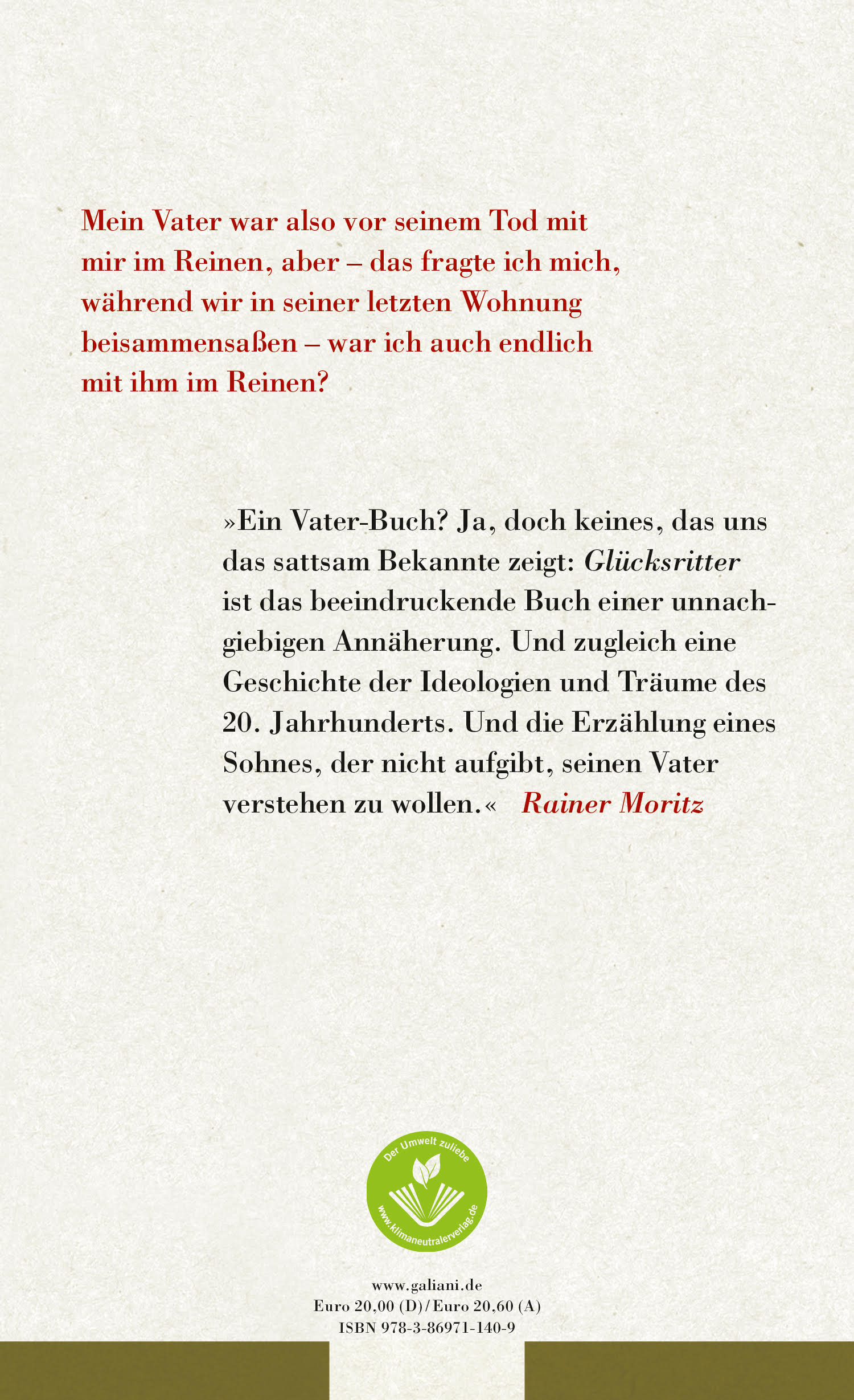 Getrieben von dem unbedingten Wunsch, verstehen zu wollen, ohne Rücksicht auf eigene Befindlichkeiten, ist Michael Kleeberg mit „Glücksritter“ beides gelungen: eine eindringlich erzählte Geschichte von den 1930er Jahren bis in die 2000er und das Porträt eines Mannes, der trotz aller Widrigkeiten seinen Weg gegangen ist.