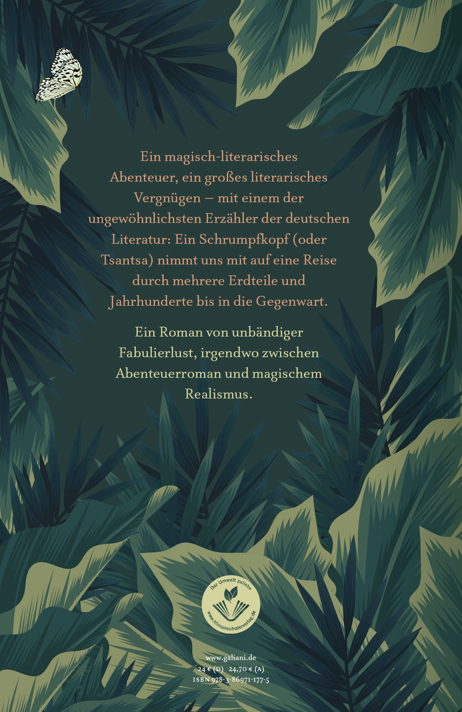 Ein großes literarisches Vergnügen: Üppig, sprachgewaltig, abenteuerlich und märchenhaft feiert Jan Koneffke die Kunst des Erzählens – mit einem Protagonisten, der seinesgleichen sucht: Ein Schrumpfkopf (oder: Tsantsa) nimmt uns mit auf eine Reise in verschiedene Erdteile und durch mehrere Jahrhunderte bis in die Gegenwart.