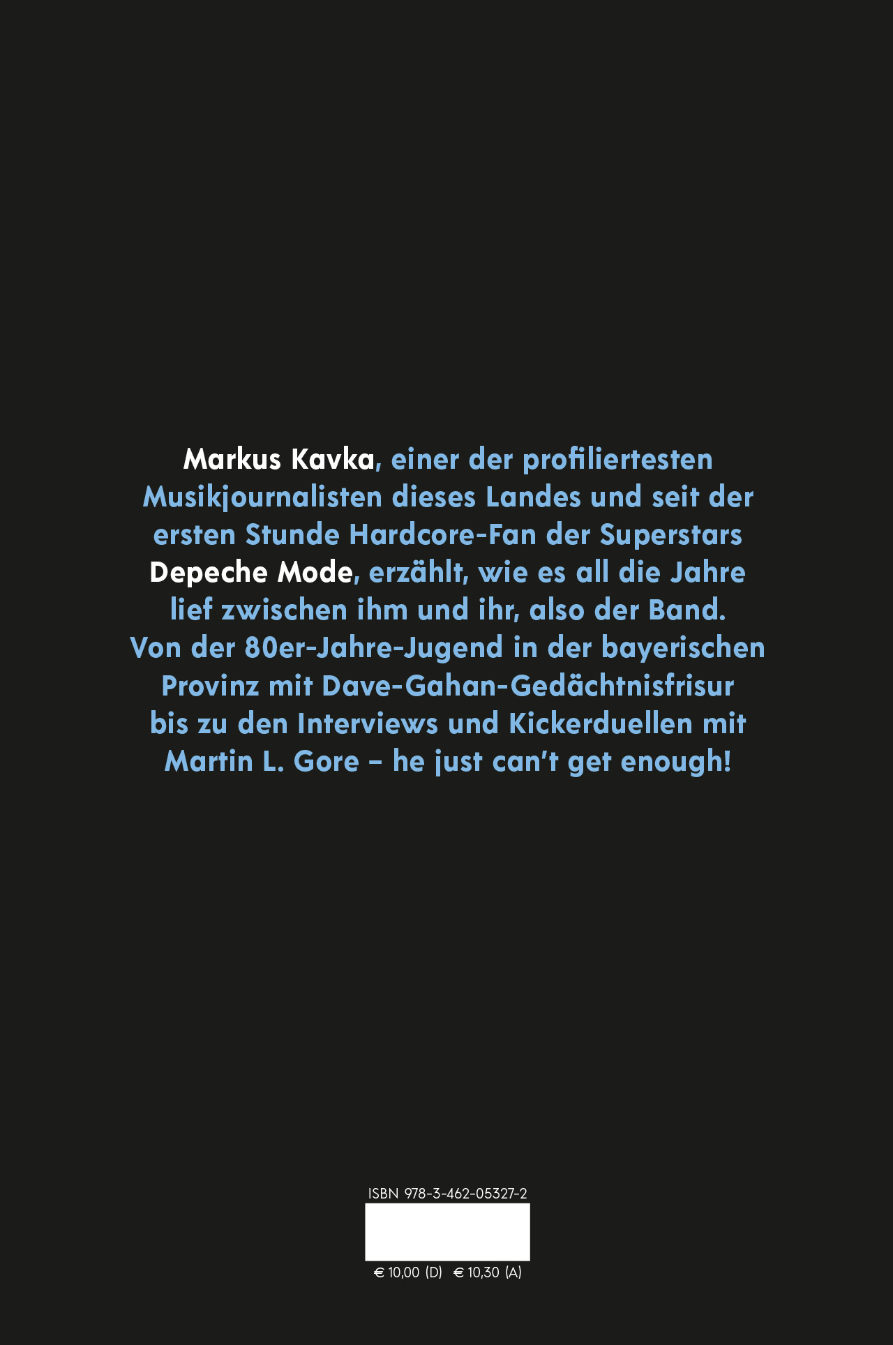 Wie ist das eigentlich, wenn man als gestandener Musikjournalist seine Lieblingsband interviewen darf? Man möchte ihnen als Fan ja eigentlich die ewige Liebe gestehen, aber professionsbedingt geht das natürlich nicht. Markus Kavka ist so ein Musikjournalist und zugleich Hardcore-Fan der Superstars Depeche Mode. In dem vorliegenden Buch verhandelt er dieses Dilemma und andere, und erzählt nebenbei hinreißend komisch von einer 80er-Jugend in der bayerischen Provinz, von der Poesie des Mixtapes, von Dave-Gahan-Gedächtnisfrisuren, Gruftis in der Bravo und von Kickerduellen mit Martin L. Gore. He just can't get enough!