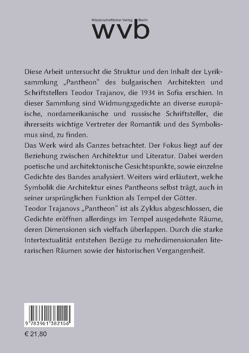 Diese Arbeit untersucht die Struktur und den Inhalt der Lyriksammlung „Pantheon“ des bulgarischen Architekten und Schriftstellers Teodor Trajanov, die 1934 in Sofia erschien. In dieser Sammlung sind Widmungsgedichte an diverse europäische, nordamerikanische und russische Schriftsteller, die ihrerseits wichtige Vertreter der Romantik und des Symbolismus sind, zu finden.