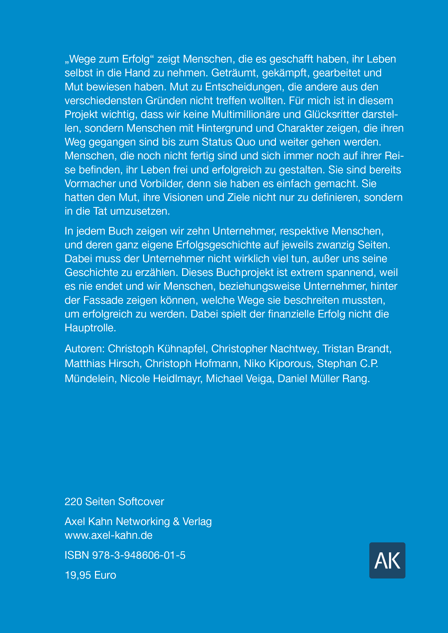 Editorial Wege zum Erfolg ist in erster Linie ein Buch für Menschen, die ihre Vorstellungen von einem erfolgreichen Leben in die Tat umsetzen wollen. Menschen, die den Schritt noch nicht gewagt haben, aber auch solche, die schon unternehmerisch tätig sind und sich neu motivieren und orientieren wollen. Dabei spielt der finanzielle Erfolg nicht die Hauptrolle. Ich selbst kann heute nach über zwanzig Jahren sagen, dass Erfolg ganz andere Formen hat als nur Geld. Diese Erkenntnis ist ein Prozess, und man muss reif sein, um das zu verstehen. Dabei sind die Selbstreflexion und die Erkenntnis daraus, dass man nicht immer höher, weiter und schneller muss, ein großer Erfolg, um Glück und Zufriedenheit zu erlangen. Somit liegt es in jedem Einzelnen selbst, ganz alleine seinen persönlichen Erfolg zu definieren und zu bestimmen. Dass Erfolg vor allem in jungen Jahren fast ausnahmslos mit einer finanziellen Größe assoziiert wird, scheint normal. Wir werden alle in eine Welt des Wettbewerbs geboren und wollen als erfolgreiche Gewinner hervorgehen. Dabei ist die Anerkennung ein Gen, das in uns Menschen extrem ausgeprägt ist und aufgrund der verschiedenen Gesellschaftsformen, Gruppierungen und medialen Fokussierungen schwierig zu kontrollieren ist. Trotzdem ist Anerkennung wichtig und immer mit den Erfolgen verbunden. Vordenker, Vormacher und Vorbilder sind alle Autoren, respektive Unternehmer in diesem Buch, und jeder hat seine ganz eigene Geschichte. Ich habe aufgrund meiner Tätigkeit als Unternehmer und Netzwerker schon früh erkannt, dass hinter jedem Unternehmer zumeist eine ganz außergewöhnliche Geschichte steht. Natürlich ist es nicht angebracht, jedem seine Geschichte zu erzählen, aber ich glaube, wenn wir mehr voneinander wissen, ist eine Vertrauensbasis besser aufzubauen und ein Business ehrlicher zu gestalten, als wenn wir weniger wissen. Somit erlangt jeder Unternehmer als Autor in diesem Buch eine authentische und spezifischere Reputation, um damit weiter erfolgreich zu arbeiten. Die Auswahl der Unternehmer war und ist mir sehr wichtig, um unterschiedliche Lebenswege, Erfahrungen und Sichtweisen aufzeigen zu können. Ich war persönlich bei einigen Gesprächen dabei, als die Unternehmer aus ihrem Leben erzählten. Es war immer emotional, motivierend und inspirierend zugleich, und ich freue mich auf viele weitere Menschen und ihre Geschichten. Ich bin selbst erfolgreicher Autor und kannte, bevor ich mein Buch geschrieben habe, die Hebelwirkung eines Buches nicht wirklich. Aus heutiger Sicht war das eine der besten Entscheidungen in meinem Leben! Von der persönlichen Reputation bis hin zur Nachhaltigkeit ist ein Buch ein Tool der Extraklasse, um sich für immer zu positionieren. Treffen auch Sie ganz bewusst die Entscheidung für „Wege zum Erfolg“ und platzieren Sie Ihre Geschichte nachhaltig! Ich wünsche Ihnen ganz viel Spaß und Inspiration beim Lesen der spannenden Erfolgsgeschichten toller Unternehmer und Menschen. Bleiben Sie erfolgreich! Herzlichst Axel Kahn