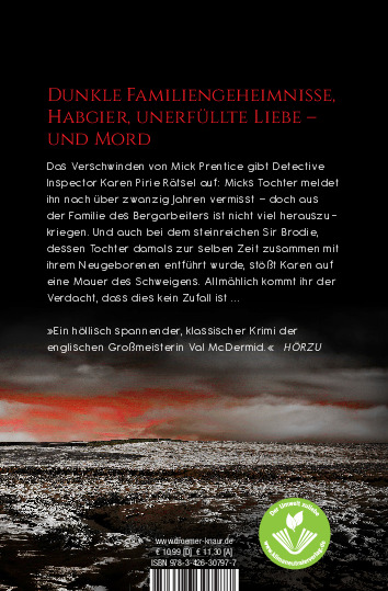 | Schlagworte | Bel Richmond • Bergarbeiterstreik • Boscolata • Cold Case • Edinburgh • Entführung • Fergus Sinclair • Glenrothes • Großbritannien • Italien • Jenny Prentice • Karen Pirie • Kirkcaldy • Leukämie • Mick Prentice • Nottingham • Polizei • Rotheswell • Schottland • Sicherheitskräfte • Spannung • Strafrecht • Straftaten • Susan Charleson • Toskana • Unfälle und Katastrophen • Val McDermid • Verbrechen und Kriminalität • Vermisstenmeldung • Vorfahren |