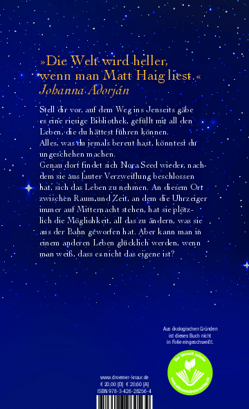 Hier findet sich Nora Seed wieder, nachdem sie aus lauter Verzweiflung beschlossen hat, sich das Leben zu nehmen. An diesem Ort, an dem die Uhrzeiger immer auf Mitternacht stehen, eröffnet sich für Nora plötzlich die Möglichkeit herauszufinden, was passiert wäre, wenn sie sich anders entschieden hätte.