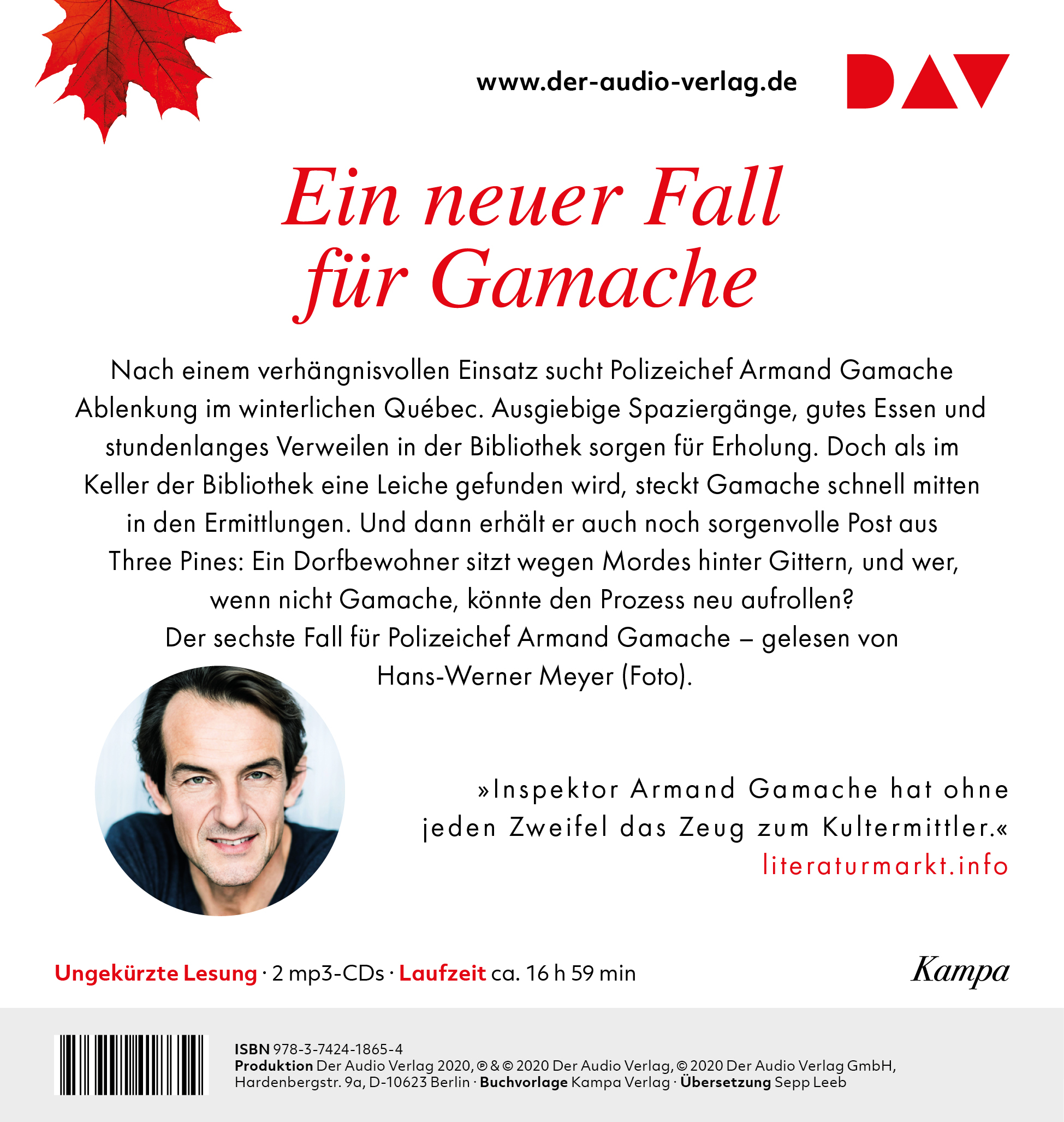 Hans-Werner Meyer, geboren 1964 in Hamburg, ist einer der bekanntesten deutschen Film- und Theaterschauspieler. Neben Engagements am Residenz-Theater in München und an der Berliner Schaubühne war er u. a. in »Der Baader Meinhof Komplex« zu sehen. Er hat bereits die fünf ersten Fälle von Gamache eingelesen.