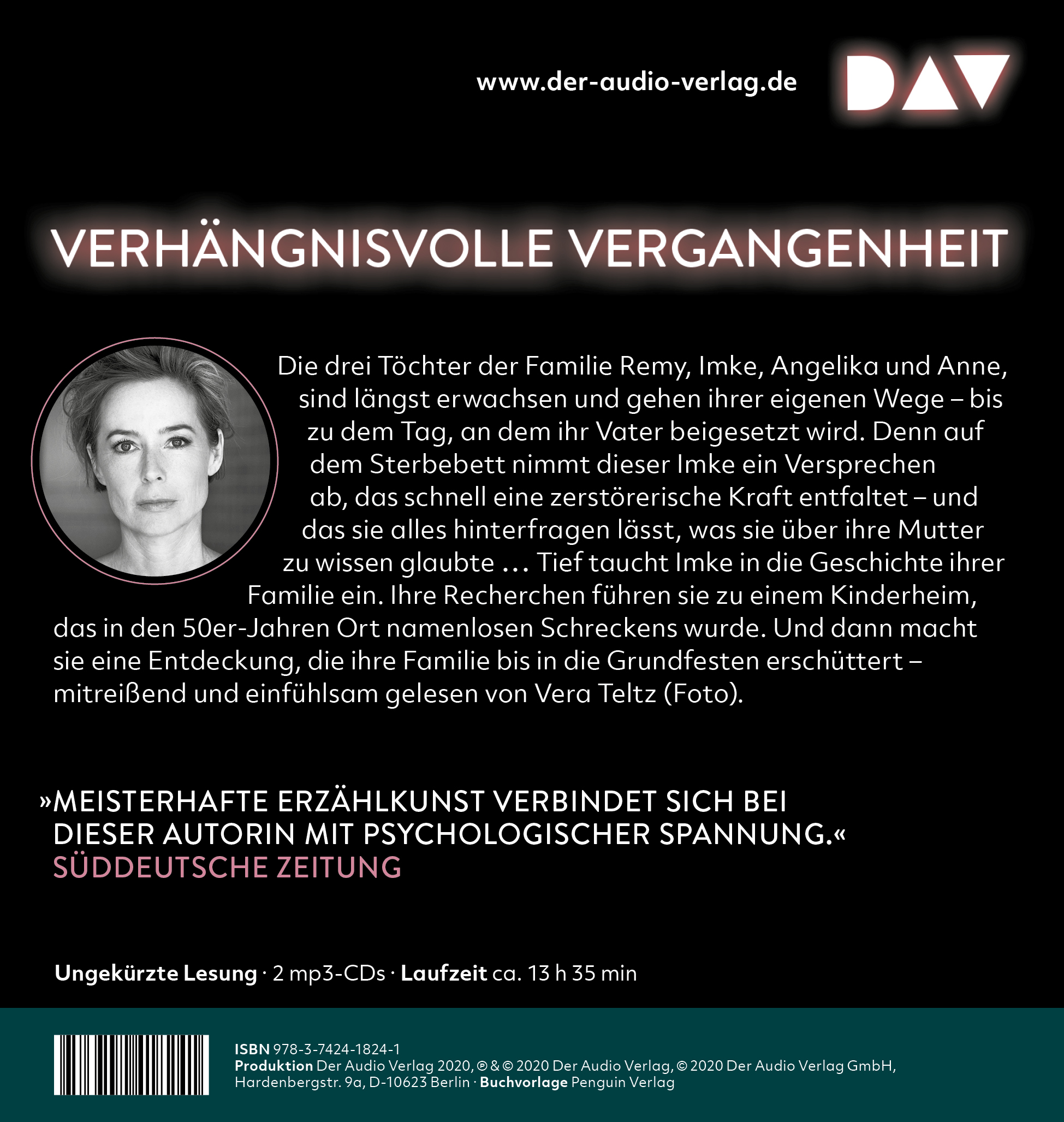 Vera Teltz, geboren 1971, absolvierte ihre Schauspielausbildung in Köln und ist eine beliebte Hörbuch- und Synchronsprecherin. Sie ist bekannt aus verschiedenen TV-Serien, u.a. als festes Ensemblemitglied in der Serie »Danni Lowinski«. Mit ihrer charakteristischen Stimme ist sie bei DAV bereits in »Die kalten Sekunden« von Remigiusz Mróz und »American Dirt« von Jeanine Cummins zu hören.