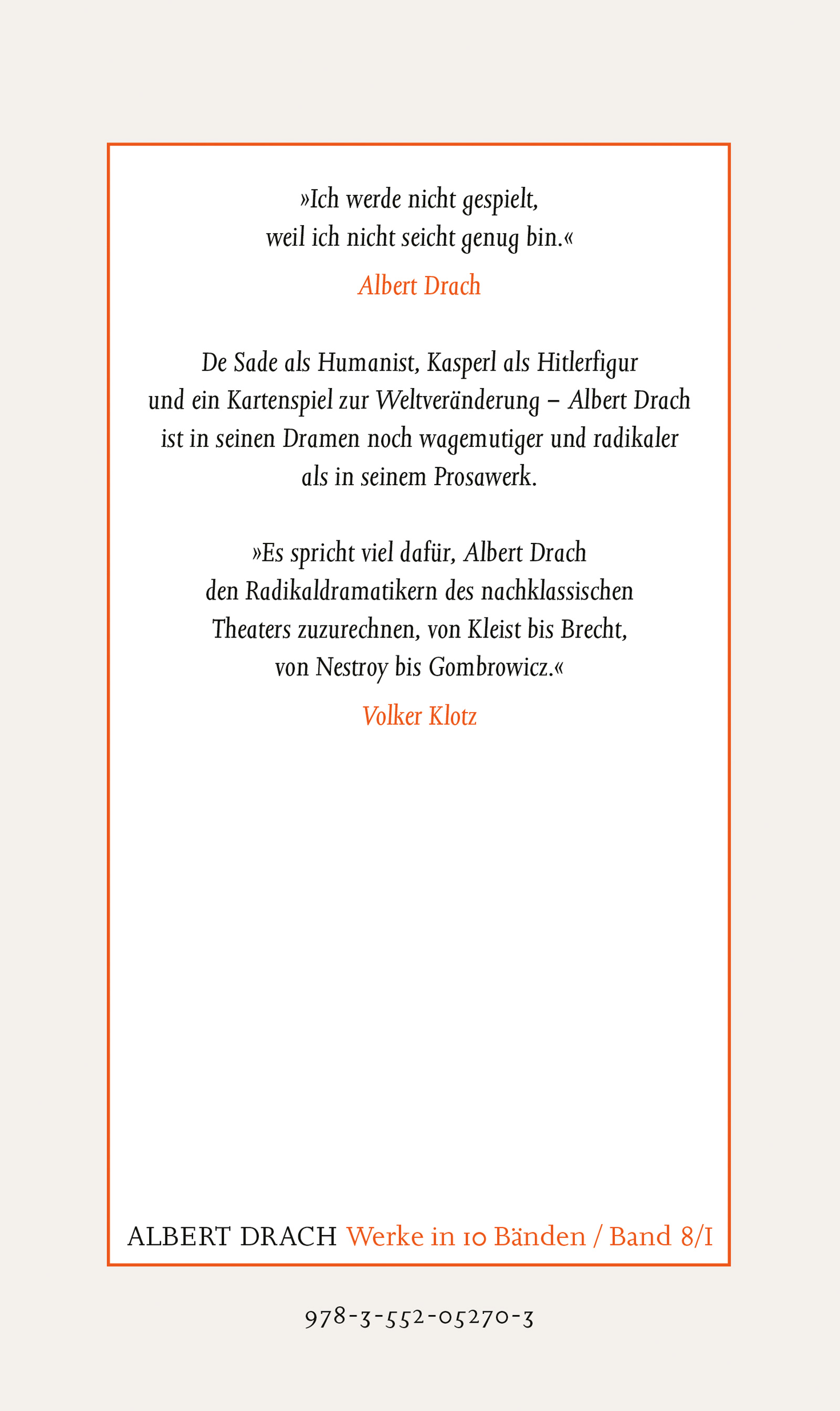 "Es spricht viel dafür, Albert Drach den Radikaldramatikern des nachklassischen Theaters zuzurechnen, von Kleist bis Brecht, von Nestroy bis Gombrowicz." Volker Klotz