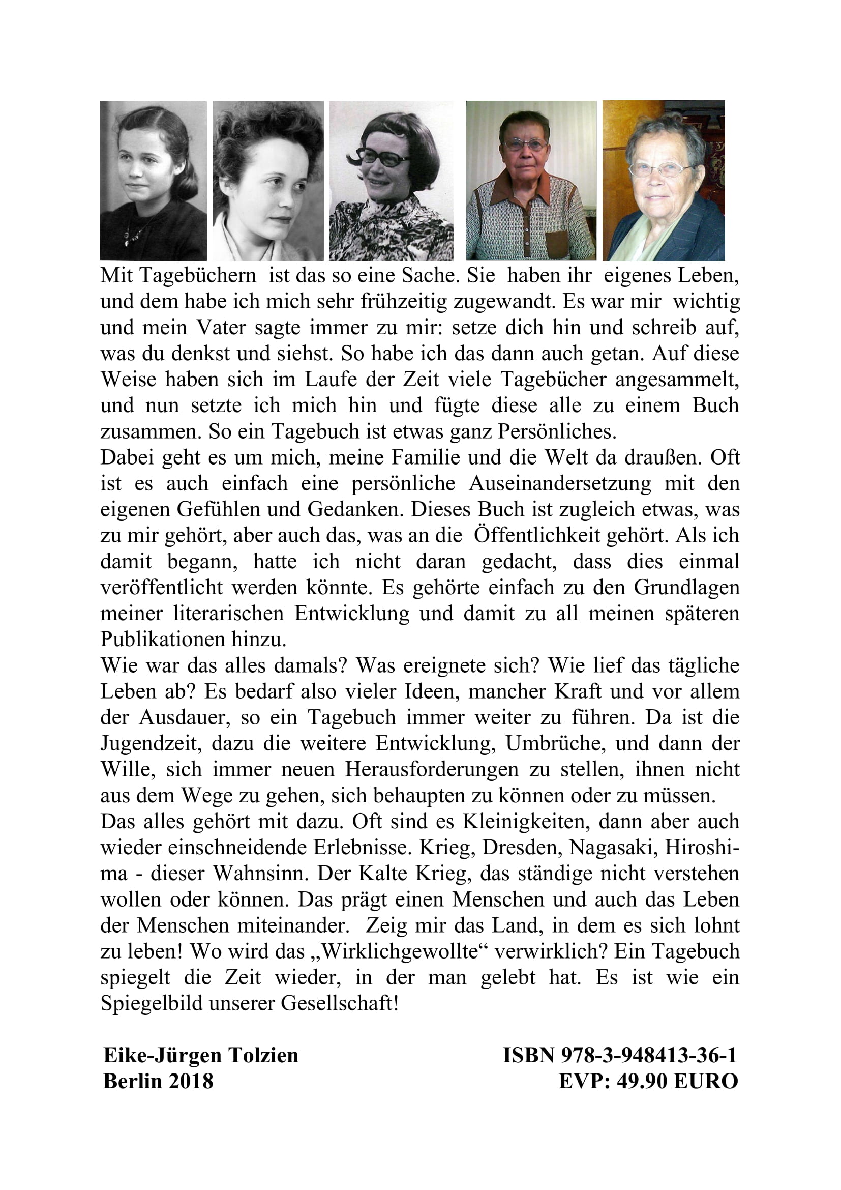 Das alles gehört mit dazu. Oft sind es Kleinigkeiten, dann aber auch wieder einschneidende Erlebnisse. Krieg, Dresden, Nagasaki, Hiroshima - dieser Wahnsinn. Der Kalte Krieg, das ständige nicht verstehen wollen oder können. Das prägt einen Menschen und auch das Leben der Menschen miteinander. Zeig mir das Land, in dem es sich lohnt zu leben! Wo wird das „Wirklichgewollte“ verwirklich? Ein Tagebuch spiegelt die Zeit wieder, in der man gelebt hat. Es ist wie ein Spiegelbild unserer Gesellschaft!