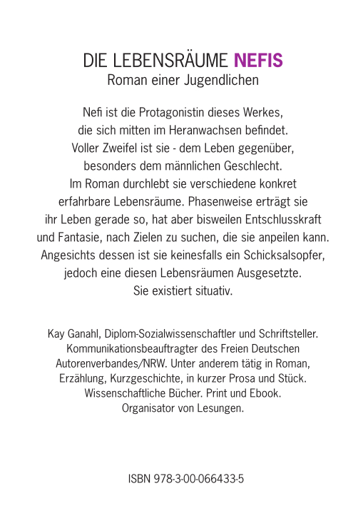 Im vorliegenden Roman wird der Begriff Raum weiter verstanden, nämlich als das Räumliche, in welchem der junge Mensch, hier vor allem die Jugendliche namens Nefi, Lebenszeit erlebt und ablebt. Dies hat etwas Tragisches. Die Jugendliche Nefi durchlebt konkret erfahrbare Lebensräume, in denen sie sich aufhält und das Leben phasenweise vielleicht nur erträgt, aber dann, zu anderen Zeiten und in anderen Situationen, zielbezogen gestalten will. Zumindest will! Sie ist angesichts dessen immerhin kein Opfer des Schicksals, sondern - so lässt es sich begreifen - eine den verschiedensten Lebensräumen Ausgesetzte. Sie existiert situativ. Nefi bezweifelt vielleicht alles, was sie in ihrem sozialen Umfeld wahrnimmt. Es kann daran liegen, dass sie unzufrieden ist und sich meist unwohl fühlt, auch weil sie mit zahlreichen Problemen konfrontiert wird. Treiben lassen kann und darf sie sich nicht! Der gelebte Alltag kommt ihr zunehmend absurd vor. Am besten findet sie, wenn sie weiß, dass sie dem Leben einen Sinn abgewinnen kann. Es ist ihr wichtig, Beziehungen zu Menschen zu knüpfen, die ihr Halt geben. Wahr ist das Tatsächliche und logisch Erklärte. Frei zu sein, muss immer und überall zumindest ein Ziel darstellen. Ihre kritische Grundhaltung zum Leben ist für sie selbstverständlich - Zweifel und Skepsis in Konfrontation mit den Lebensverhältnissen erfüllen sie zwar nicht, erhellen aber ihren intellektuellen Horizont!
