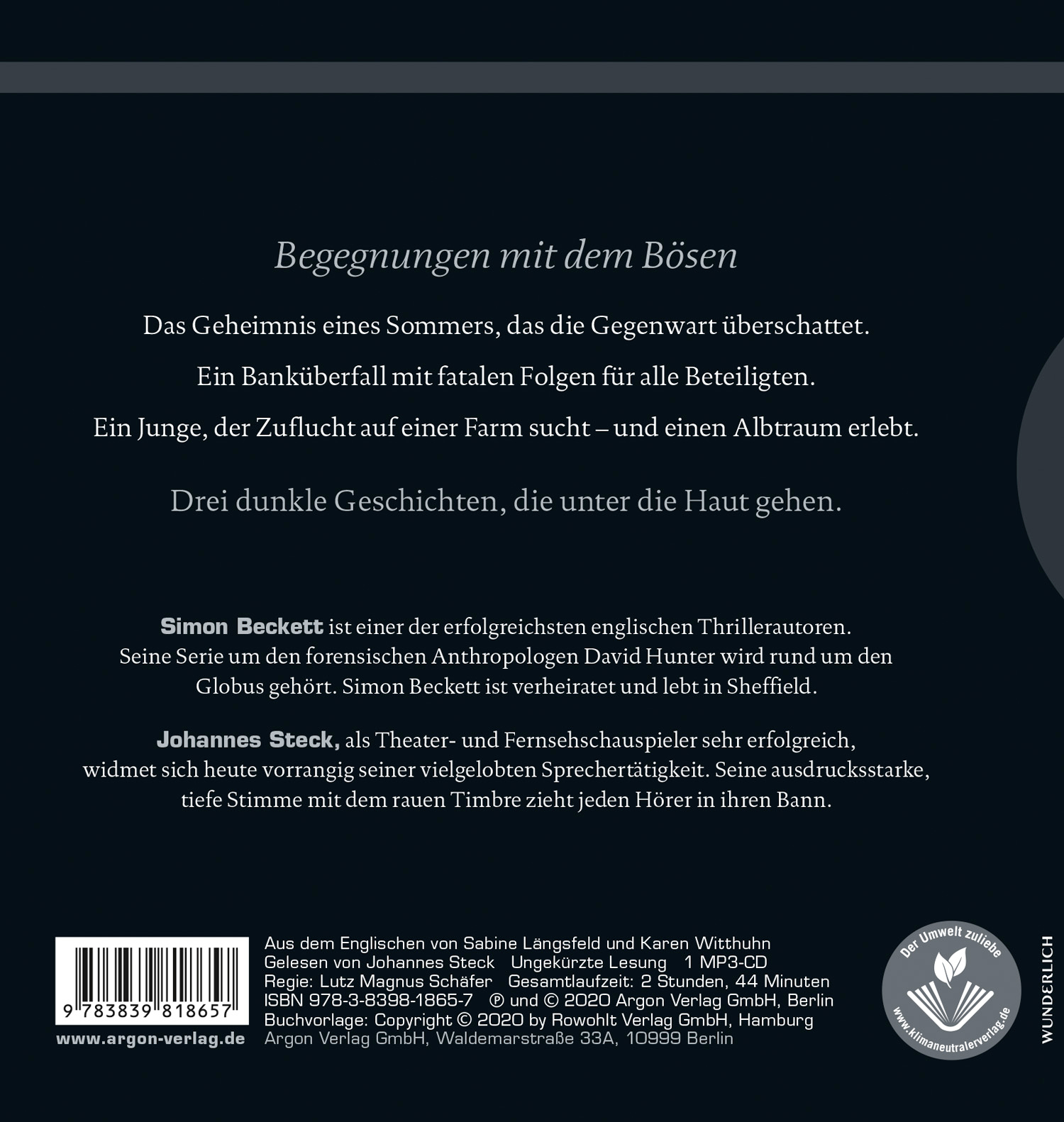 Drei Geschichten, die Begegnungen mit dem Bösen erzählen. Exzellent geschrieben, atmosphärisch-dicht, spannend und düster, zeigen sie die Vielseitigkeit von Simon Beckett als Spannungsautor. Gänsehaut garantiert!