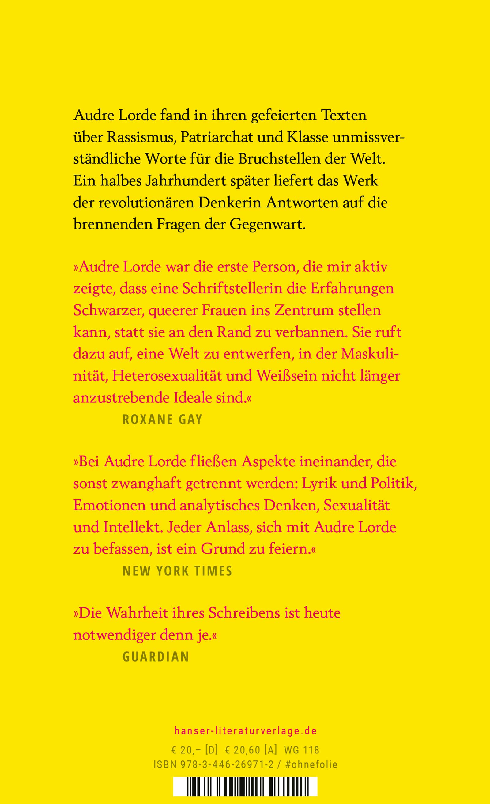 Lorde widmete ihr Schaffen dem Kampf gegen Unterdrückung. Verschiedenheit und Schwesternschaft, Zorn, Erotik und Sprache wurden zu kraftvollen Waffen. In ihren Texten über Rassismus, Patriarchat und Klasse finden wir Antworten auf die brennenden Fragen der Gegenwart – ein halbes Jahrhundert nach Erscheinen beweist der Band seine erschreckende Aktualität.