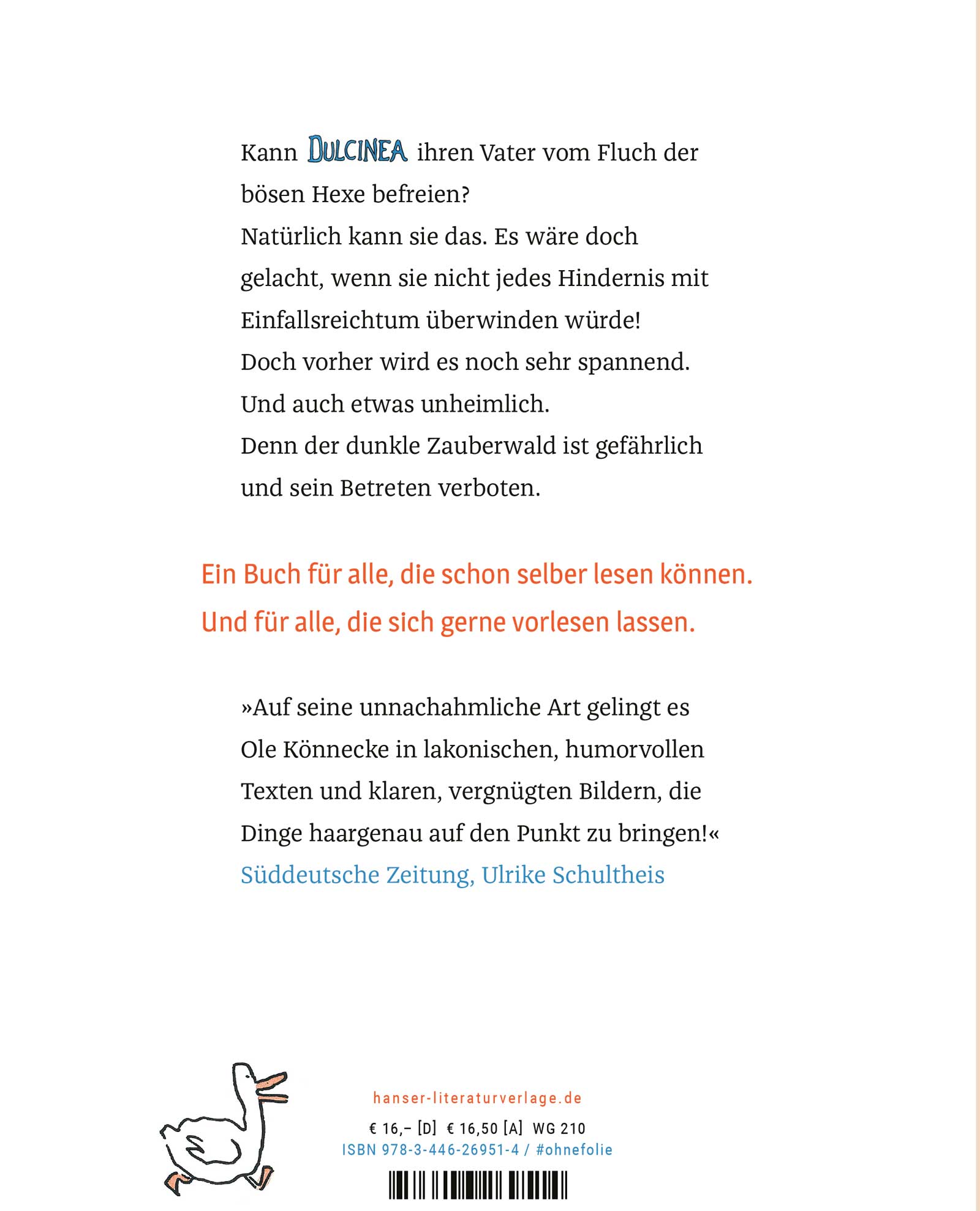 Der dunkle Hexenwald ist gefährlich und sein Betreten verboten. Das hat Dulcinea schon als kleines Kind gelernt. Doch für ihre Geburtstagspfannkuchen ist ihr Vater dort Blaubeeren sammeln gegangen. Hat ihn die Hexe vielleicht verzaubert? Dulcinea zögert keine Sekunde, ihn zu suchen, als er nicht zurückkommt. Entschlossen überwindet sie das dornige Gestrüpp des Waldes. Unerschrocken quert sie den Burggraben voller Ungeheuer. Und mutig erklimmt sie die mit Efeu umrankte Burgmauer - bis sie im Hexenturm steht. Kann sie der Hexe sogar ihr geheimes Buch mit Zaubersprüchen abluchsen? Ihr Vater hätte sie kaum nach der tapferen Dulcinea benannt, wenn sie nicht jeden Hexenbann brechen könnte, um abends mit ihm Geburtstag zu feiern.