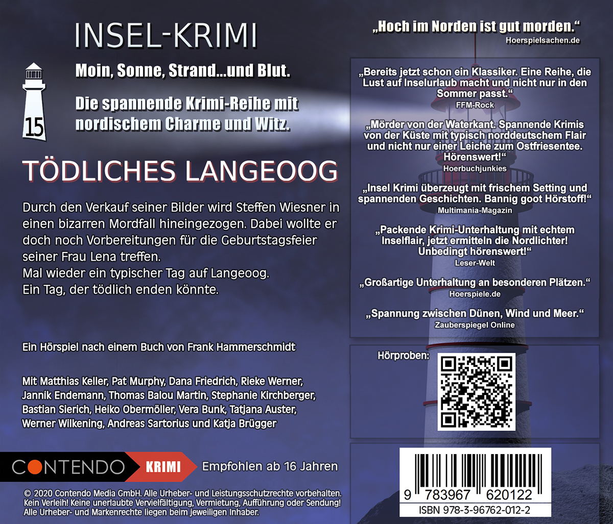 Durch den Verkauf seiner Bilder wird Steffen Wiesner in einen bizarren Mordfall hineingezogen. Dabei wollte er doch noch Vorbereitungen für die Geburtstagsfeier seiner Frau Lena treffen. Mal wieder ein typischer Tag auf Langeoog. Ein Tag, der tödlich enden könnte.Lassen Sie sich fesseln vom norddeutschen Charme, frechem Humor, bekannten Synchronstimmen, orchestralem Soundtrack und realistischen Sounds. Ein einmaliges Hörspiel-Erlebnis in seiner schönsten Form!- Sprecher: Steffen Wiesner - Matthias Keller, Hans-Dieter Berg - Pat Murphy, Lena Roehl-Wiesner - Dana Friedrich, Wiebke Renken - Rieke Werner, Jan Lührs - Jannik Endemann, Dr. Rademacher - Thomas Balou Martin, Kommissarin Sögaard - Stephanie Kirchberger, Marten Lührs - Bastian Sierich, Niels Aulmann - Heiko Obermöller, Ineke Lührs - Vera Bunk, Anne Aulmann - Tatjana Auster, Arndt Bartelsen - Werner Wilkening, Lukasz Zielinski - Andreas Sartorius, Kundin - Katja BrüggerPressestimmen"Sie ermitteln da, wo andere Urlaub machen. Feine Regionalkrimis von den deutschen Inseln." - Hoerspielsachen"Mörder von der Waterkant. Spannende Krimis von der Küste mit typisch norddeutschem Flair und nicht nur einer Leiche zum Ostfriesentee. Hörenswert!" - Hoerbuchjunkies"Insel Krimi überzeugt mit frischem Setting und spannenden Geschichten. Bannig goot Hörstoff!" - Multimania-Magazin"Packende Krimi-Unterhaltung mit echtem Inselflair, jetzt ermitteln die Nordlichter! Unbedingt hörenswert!" - Leser-Welt"Großartige Unterhaltung an besonderen Plätzen." - Hoerspiele.de"Spannung zwischen Dünen, Wind und Meer." - Zauberspiegel Online