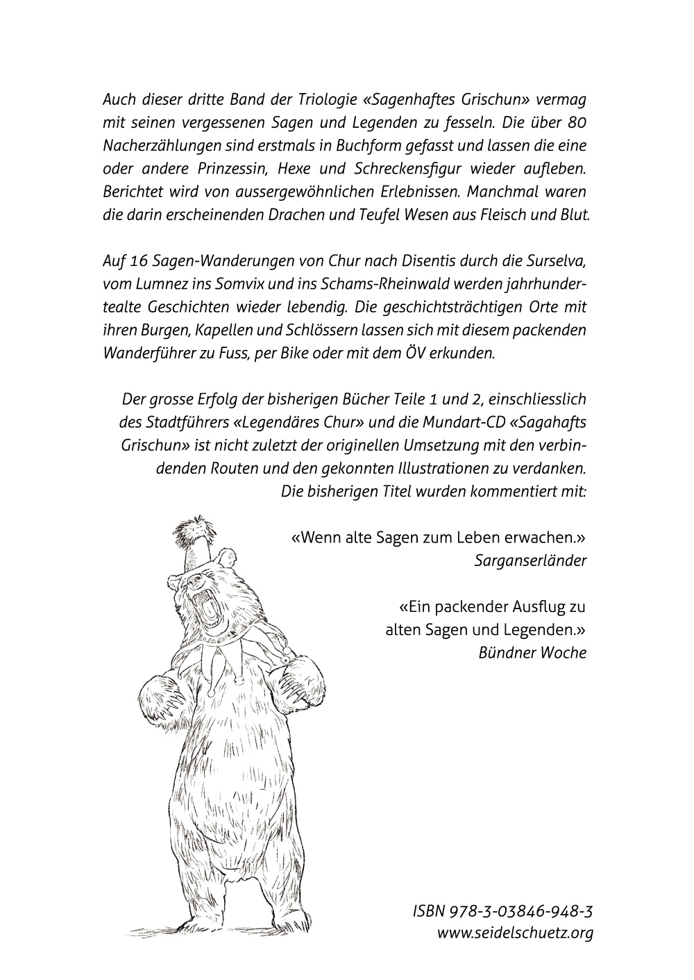 Über 200 Erzählungen aus dem Gebiet der historischen Drei Bünde sind damit erstmals in Buchform greifbar und lassen die eine oder andere Bellezza und Hexe, Schreckensfigur und Geisterhand wieder aufleben. Die Buchtrilogie in Form von packenden Wanderführern begleitet uns zu Burgen und Schlössern, Klöstern und Kirchen im heutigen Graubünden und darüber hinaus.