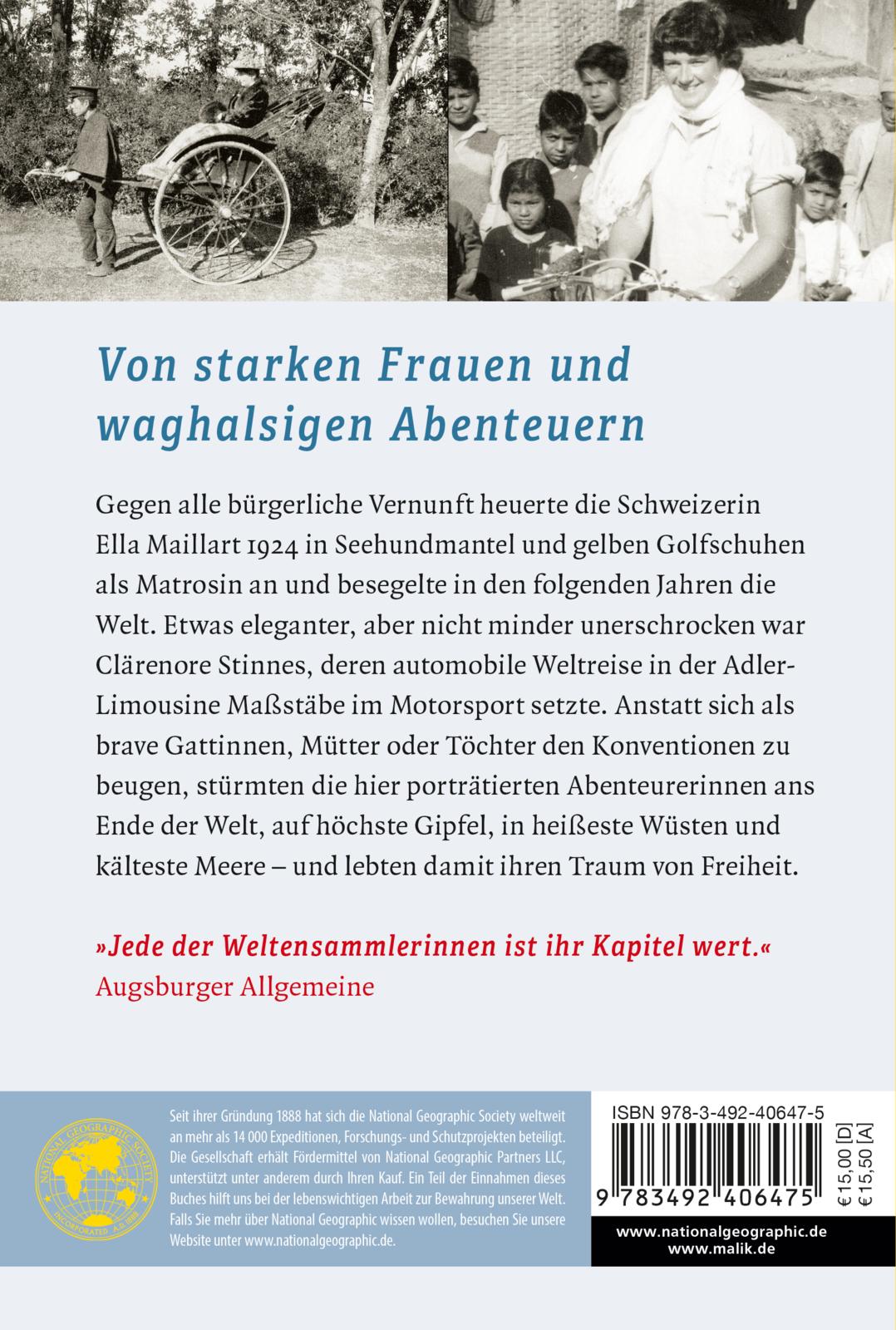 Vor diesen Frauen kann man nur den Hut ziehen: Die Schweizerin Ella Maillart heuerte gegen alle bürgerliche Vernunft anno 1924 in Seehundmantel und gelben Golfschuhen als Matrosin an und besegelte in den folgenden Jahren die Welt. Etwas eleganter, aber nicht minder waghalsig war Clärenore Stinnes, deren automobile Weltreise in der Adler-Limousine bis heute Maßstäbe im Motorsport setzt. Die dreiundsechzigjährige Amerikanerin Annie Taylor war vor allem eine gewitzte Selbstvermarkterin. Bereits zu Beginn des 20. Jahrhunderts ließ sie sich auf die Klatschpresse ein, um ihr waghalsiges Abenteuer zu finanzieren: sich in einem Fass die Niagarafälle hinabzustürzen.