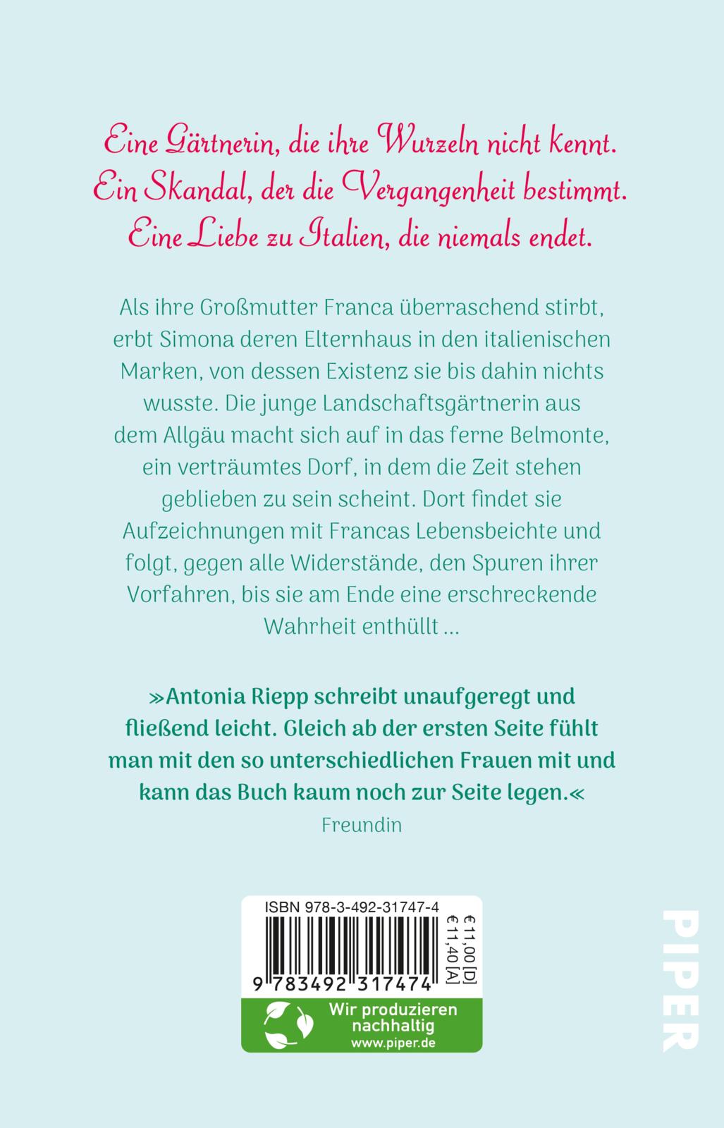 Antonia Riepp ist das Pseudonym einer bekannten deutschen Bestsellerautorin. Wer die lebhaften Dorfbewohner von Belmonte kennen- und lieben gelernt hat, darf sich freuen, denn »Belmonte« ist der erste Teil einer Trilogie. Der Fortsetzungen »Villa Fortuna« und »Santo Fiore« ziehen die Leserinnen ebenfalls mit der berührenden wie fesselnden Erzählung in ihren Bann.