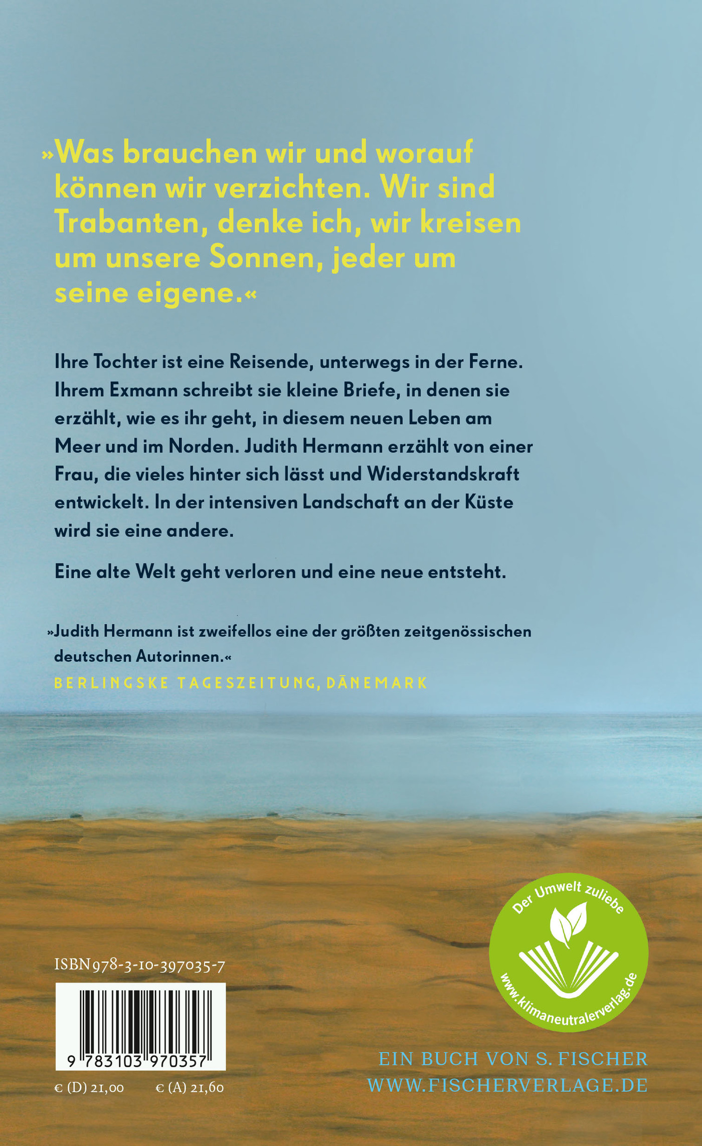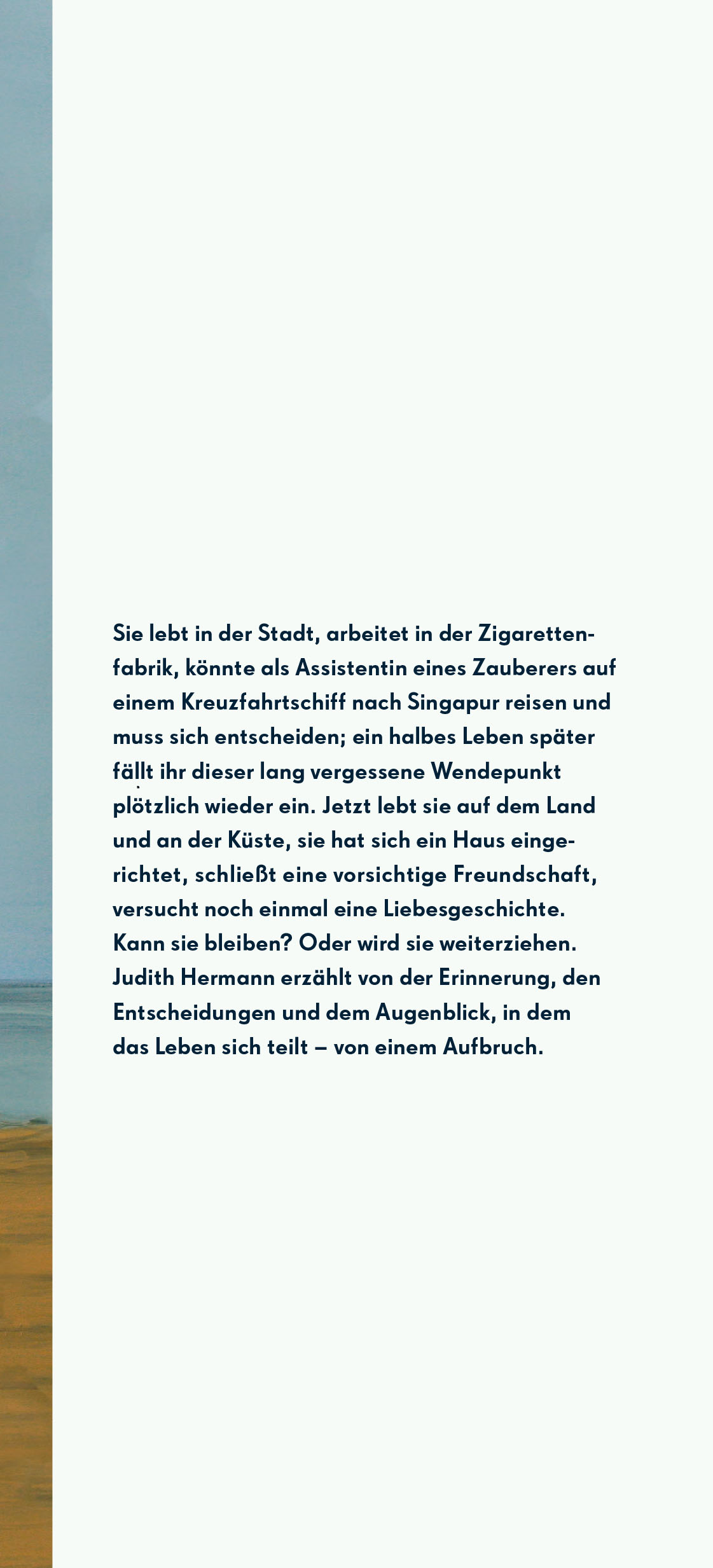 Sie schließt vorsichtige Freundschaften, versucht eine Affaire, fragt sich, ob sie heimisch werden könnte oder ob sie weiterziehen soll. Judith Hermann erzählt von einer Frau, die vieles hinter sich lässt, Widerstandskraft entwickelt und in der intensiven Landschaft an der Küste eine andere wird.