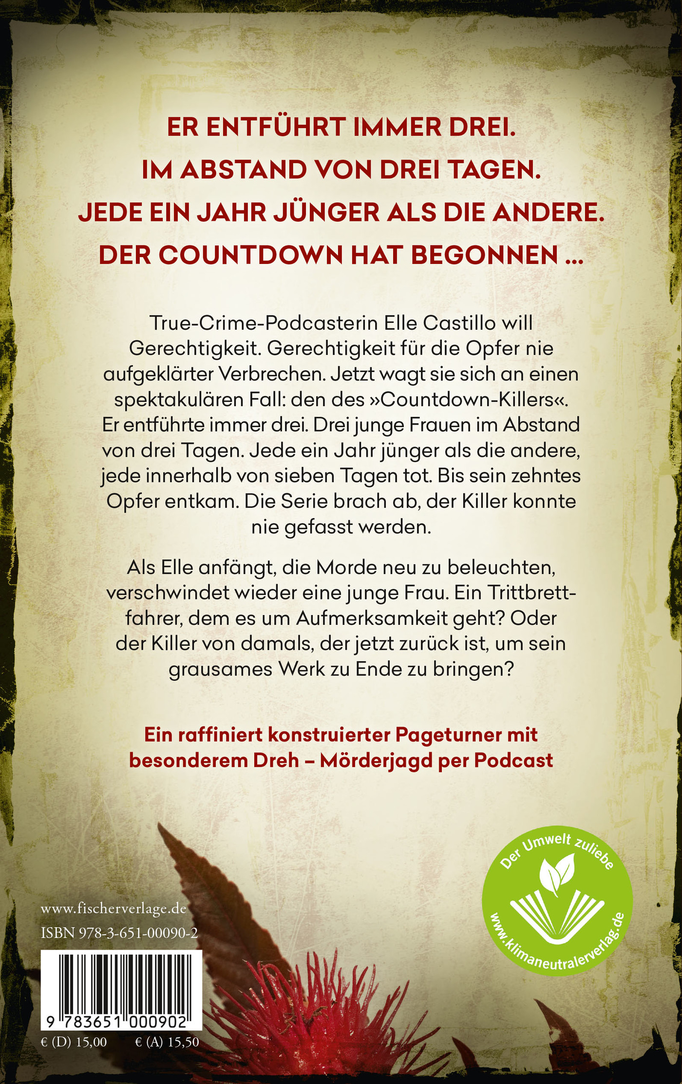 Er entführt immer drei. Jede ein Jahr jünger als die andere. Die Thriller-Entdeckung des Jahres. True-Crime-Podcasterin gegen Serienkiller: Der Countdown hat begonnen. Temporeicher Pageturner mit besonderem Dreh – Mörderjagd per Podcast. Für Fans von »Auris« und »Der Kastanienmann«.