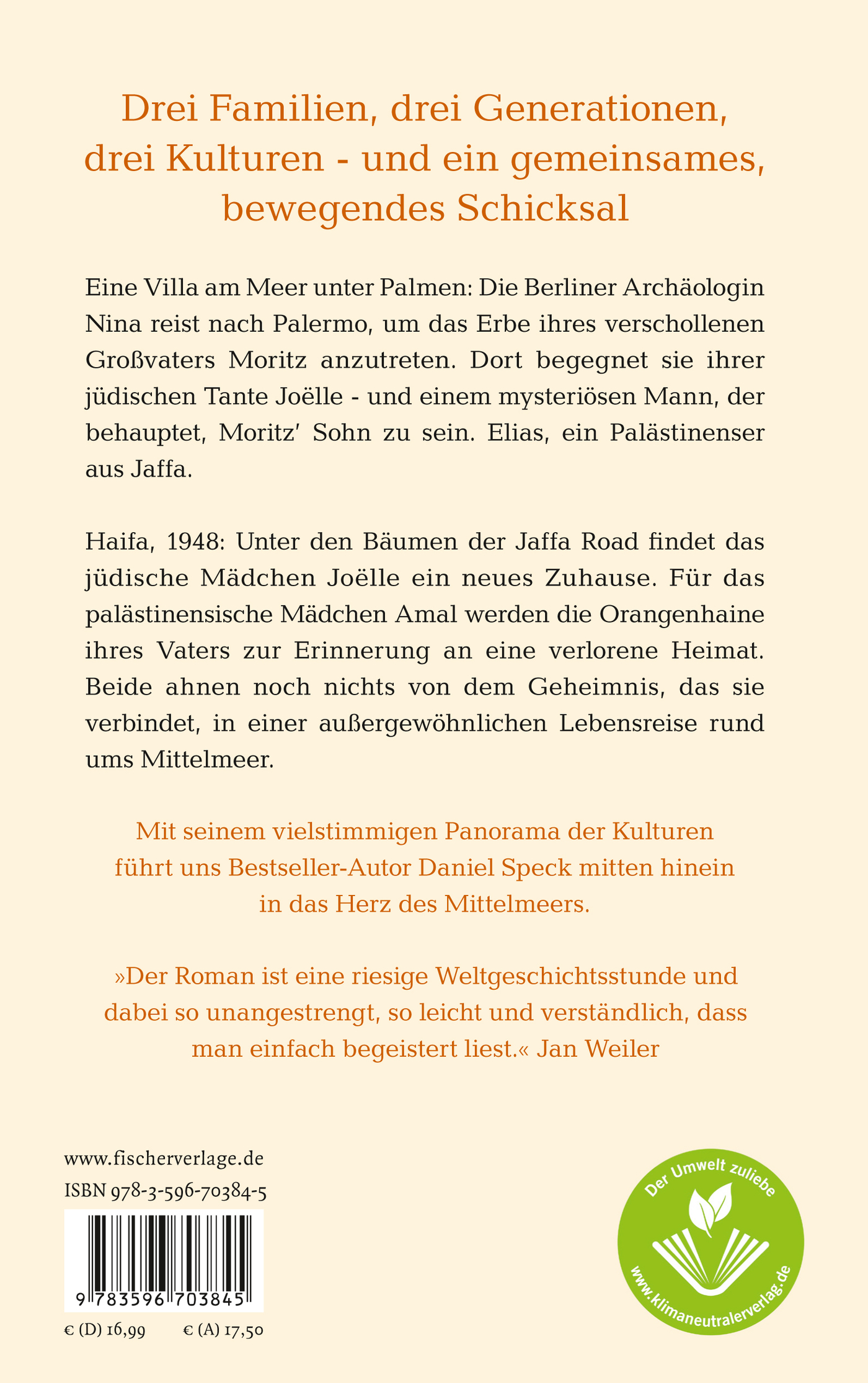 Drei Familien, drei Generationen, drei Kulturen - und ein gemeinsames, bewegendes Schicksal: Mit dem Bestseller ›Piccola Sicilia‹ führt Daniel Speck uns auf eine Reise ins Herz des Mittelmeers. Dieses vielstimmige Panorama der Kulturen erweitert er in seinem neuen Familienroman ›Jaffa Road‹. Fortsetzung und Abschluss des Bestsellers »Piccola Sicilia«. Emotionales, zeitgeschichtliches Familienepos über die Begegnung verschiedener Kulturen.