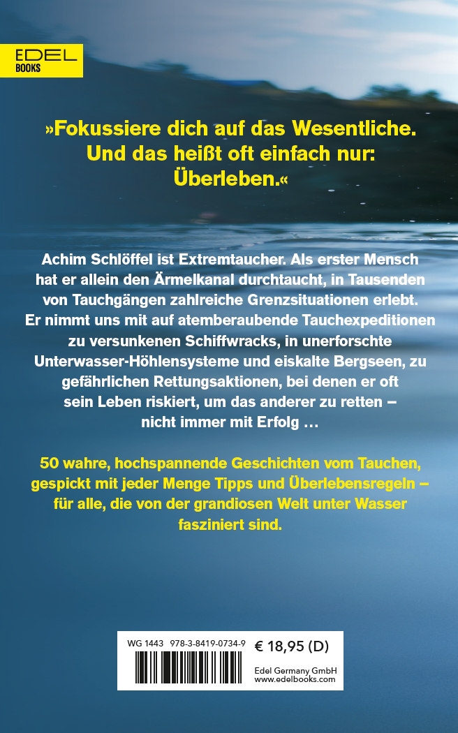 Achim Schlöffel ist Extremtaucher. Als erster Mensch hat er allein den Ärmelkanal durchtaucht, in Tausenden von Tauchgängen zahlreiche Grenzsituationen erlebt. In 50 hochspannenden Berichten erklärt er den Sog der Tiefe und den richtigen Umgang mit der Angst, erzählt von seinen aufregendsten und gefährlichsten, aber auch schönsten Erlebnissen in der faszinierenden Welt unter Wasser. Er nimmt uns mit auf atemberaubende Tauchexpeditionen zu versunkenen Schiffwracks, in unerforschte Unterwasser-Höhlensysteme und eiskalte Bergseen, zu gefährlichen Rettungsaktionen, bei denen er mehrfach sein Leben riskiert, um das anderer zu retten - nicht immer mit Erfolg. Dazu liefert der Tauchprofi eine Menge Tipps für ambitionierte Hobbytaucher, u.a. seine spektakulärsten Wracks, Höhlen und Tauchplätze, sowie die wichtigsten zehn Überlebensregeln. Eine der ersten: Zwischen "Ich kann nicht mehr" und "Es geht nicht mehr" ist immer noch genug Luft, um weiterzumachen.