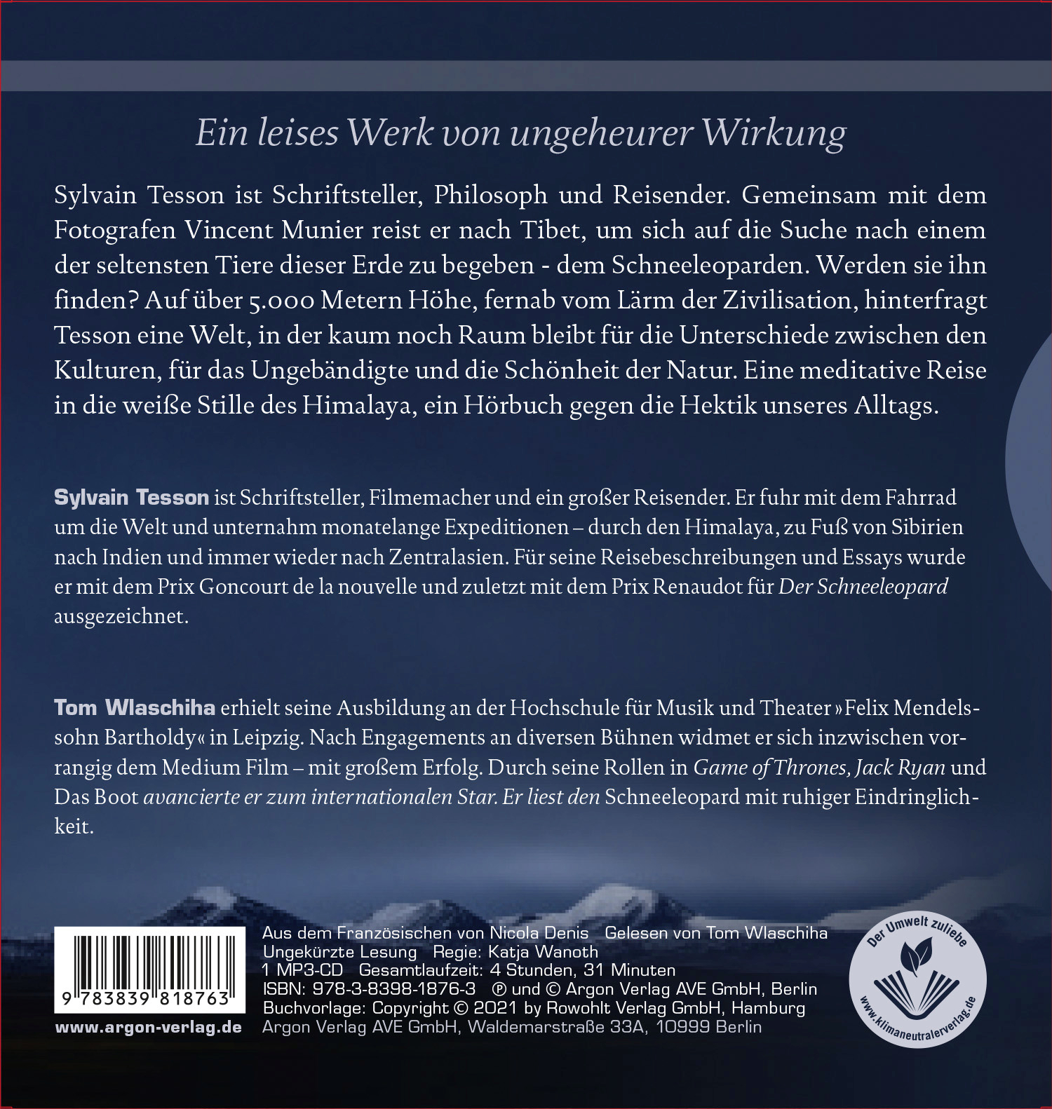 Sylvain Tesson ist Schriftsteller, Philosoph und Reisender. Gemeinsam mit dem Fotografen Vincent Munier reist er nach Tibet, um sich auf die Suche nach einem der seltensten Tiere dieser Erde zu begeben - dem Schneeleoparden. Werden sie ihn finden? Ungewiss! Auf über 5.000 Metern Höhe, fernab vom Lärm der Zivilisation, hinterfragt Tesson eine Welt, in der kaum noch Raum bleibt für die Unterschiede zwischen den Kulturen, für das Ungebändigte und die Schönheit der Natur. Eine meditative Reise in die weiße Stille des Himalaya, eine Lektüre gegen die Hektik unseres Alltags.