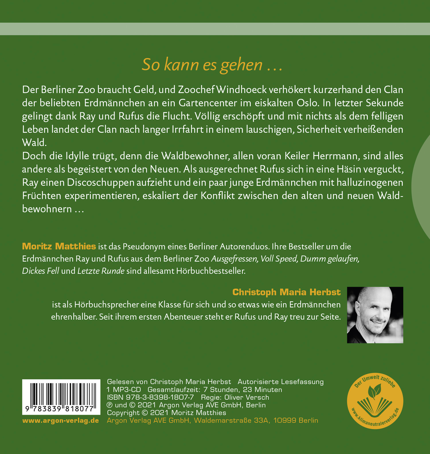 Band 6 der Bestseller-Reihe um die beliebten Erdmännchen Ray und Rufus verspricht wieder ein tierisches Krimi-Vergnügen, in dem die Erdmännchen aus dem Berliner Zoo in den Wald fliehen. Dort erwarten sie neue Abenteuer, vom grandiosen Hörbuch-Sprecher und "Erdmännchen ehrenhalber" Christoph Maria Herbst köstlich umgesetzt.