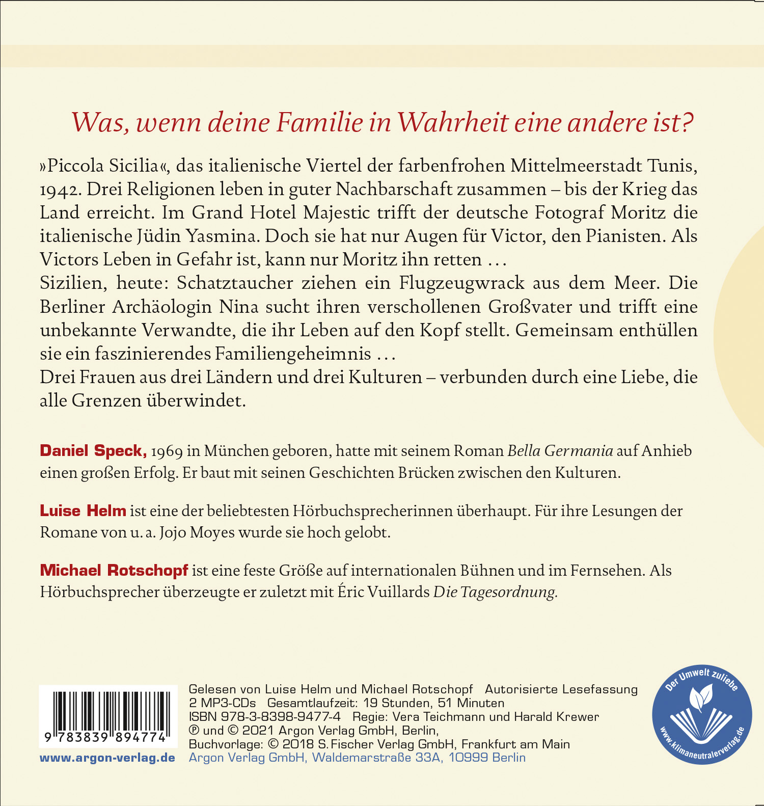 »Piccola Sicilia«, das italienische Viertel der lebensfrohen Mittelmeerstadt Tunis, 1942. Drei Religionen leben in guter Nachbarschaft zusammen - bis der Krieg das Land erreicht. Im Grand Hotel Majestic begegnet der deutsche Fotograf Moritz der Liebe seines Lebens, dem Zimmermädchen Yasmina. Doch sie hat nur Augen für Victor, den charmanten Pianisten. Als Victors Leben auf dem Spiel steht, kann nur Moritz ihn retten ... Sizilien, heute: das Mittelmeer, glitzerndes Blau. Schatztaucher ziehen ein altes Flugzeugwrack aus der Tiefe. Die Berliner Archäologin Nina sucht ihren verschollenen Großvater Moritz und trifft eine unbekannte Verwandte aus Haifa, die ihr Leben verändert. Gemeinsam enthüllen sie ein faszinierendes Familiengeheimnis. Drei Frauen aus drei Ländern und drei Kulturen - verbunden durch eine Liebe, die alle Grenzen überwindet.