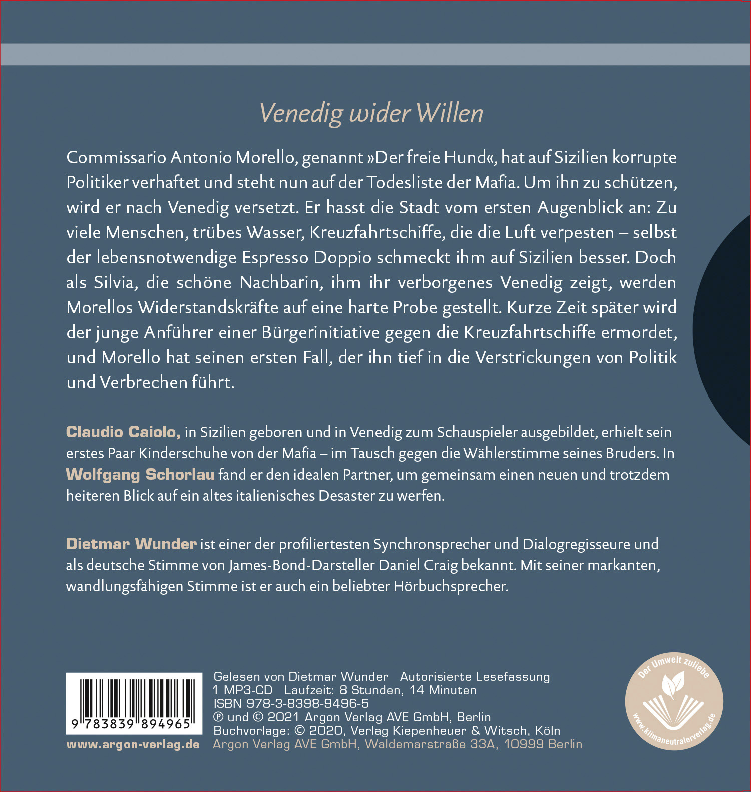 Commissario Antonio Morello, genannt »Der freie Hund«, hat auf Sizilien korrupte Politiker verhaftet und steht nun auf der Todesliste der Mafia. Um ihn zu schützen, wird er nach Venedig versetzt. Er hasst die Stadt vom ersten Augenblick an: Zu viele Menschen, trübes Wasser, Kreuzfahrtschiffe, die die Luft verpesten - selbst der lebensnotwendige Espresso Doppio schmeckt ihm auf Sizilien besser. Doch als Silvia, die schöne Nachbarin, ihm ihr verborgenes Venedig zeigt, werden Morellos Widerstandskräfte auf eine harte Probe gestellt.