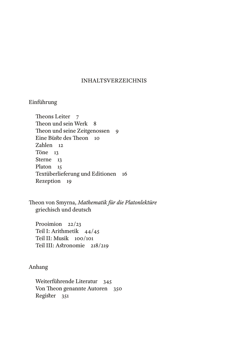 EinführungTheons Leiter 7Theon und sein Werk 8Theon und seine Zeitgenossen 9Eine Büste des Theon 10Zahlen 12Töne 13Sterne 13Platon 15Textüberlieferung und Editionen 16Rezeption 19Theon von Smyrna, Mathematik fur die Platonlekturegriechisch und deutschProoimion 22/23Teil I: Arithmetik 44/45Teil II: Musik 100/101Teil III: Astronomie 218/219AnhangWeiterführende Literatur 345Von Theon genannte Autoren 350Register 351