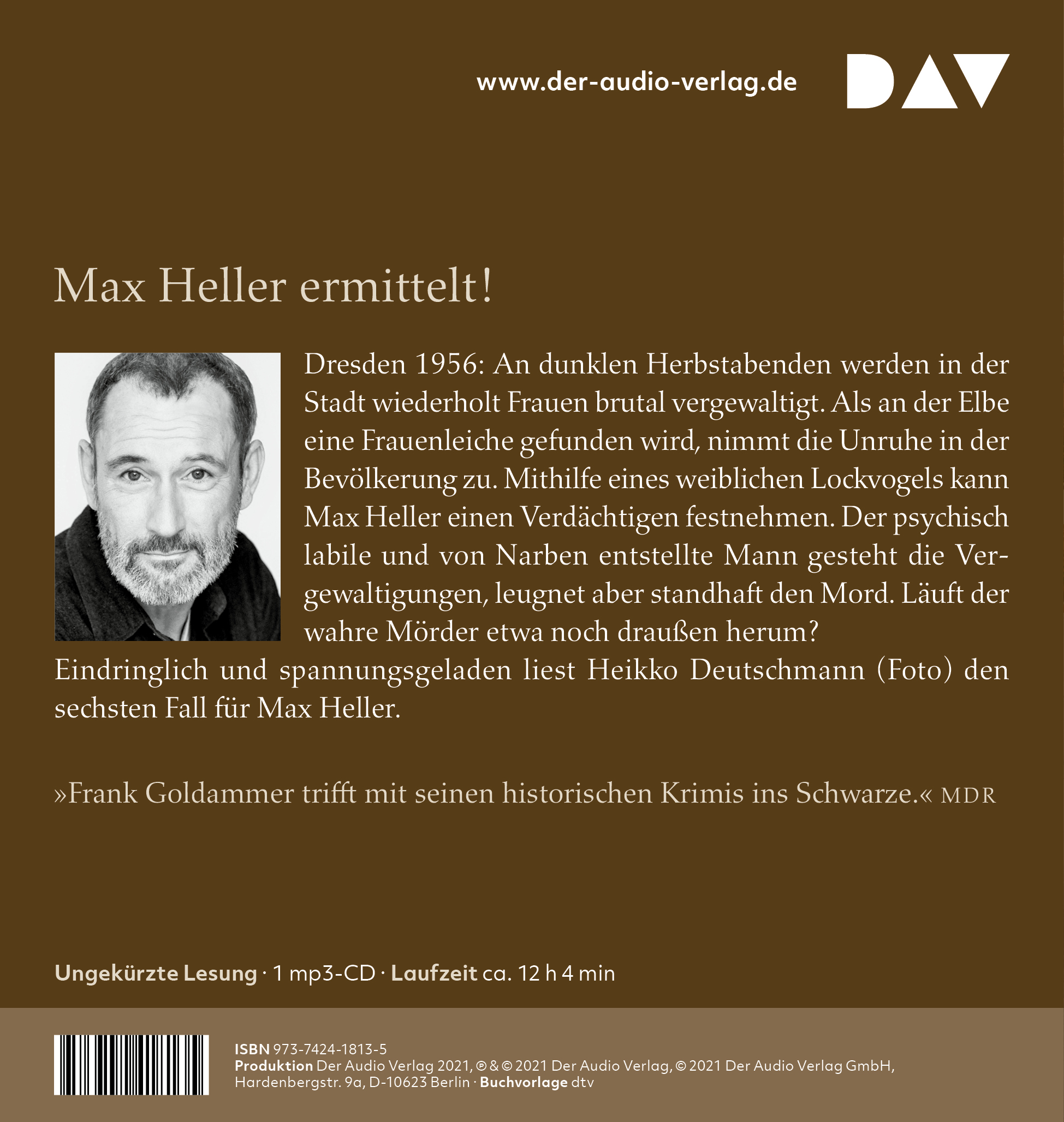 Heikko Deutschmann, geboren 1962, ist Schauspieler und Drehbuchautor. Er zählt zu den renommiertesten deutschen Hörbuchsprechern und hat für DAV bereits viele erfolgreiche Krimis eingelesen, darunter auch die ersten fünf Krimis von Frank Goldammer.