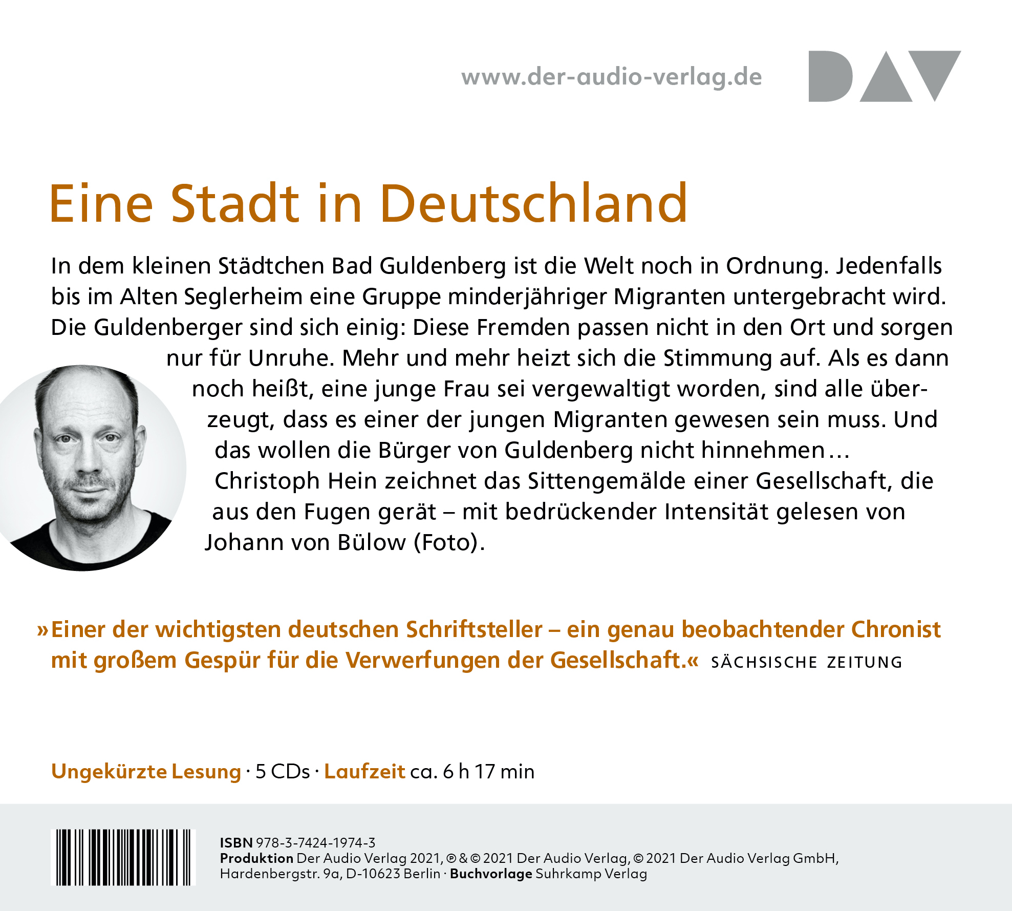 Der neue Roman eines der wichtigsten Schriftsteller der Gegenwart: Das Panorama einer deutschen Kleinstadt: fein gezeichnet und beklemmend aktuell. Christoph Hein zeichnet das Sittengemälde einer Gesellschaft, die aus den Fugen gerät, – mit bedrückender Intensität gelesen von Johann von Bülow.