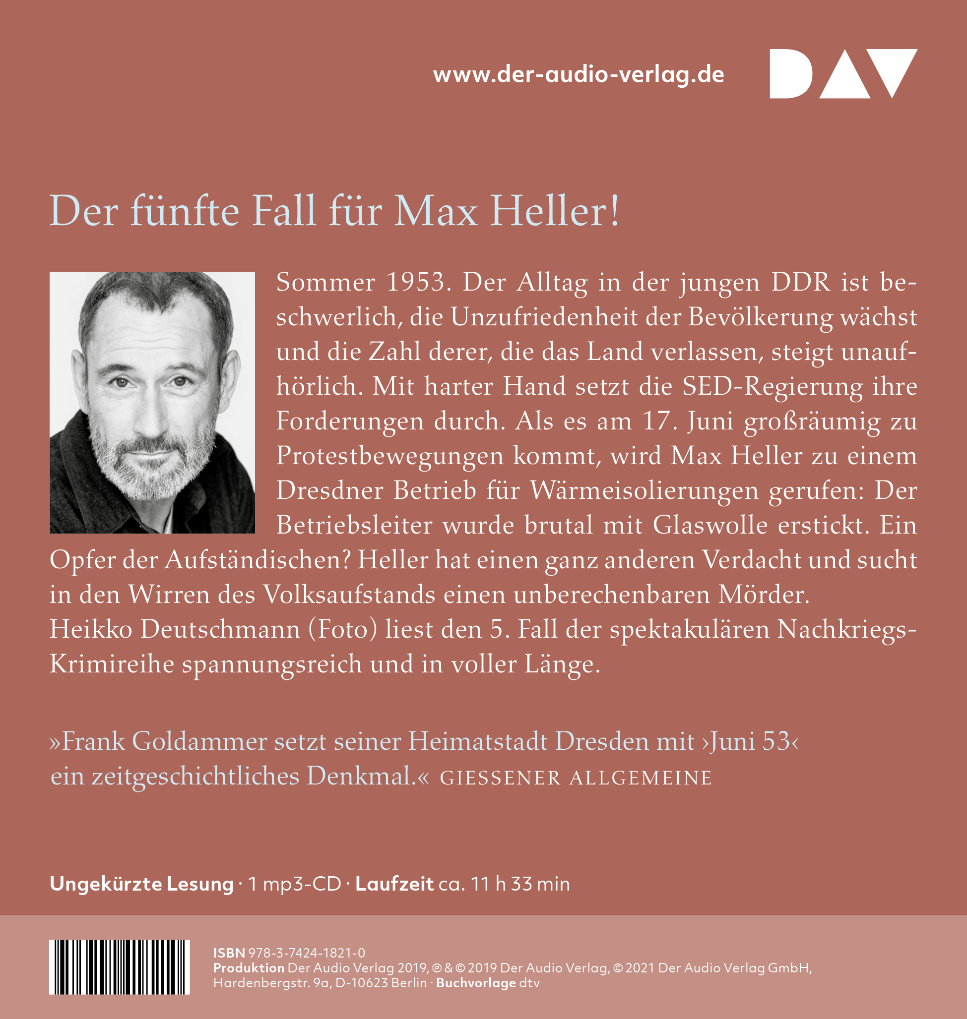 Heikko Deutschmann, geboren 1962, ist Schauspieler und Drehbuchautor. Er zählt zu den renommiertesten deutschen Hörbuchsprechern und hat für DAV bereits viele erfolgreiche Krimis eingelesen, darunter auch die ersten fünf Krimis von Frank Goldammer.