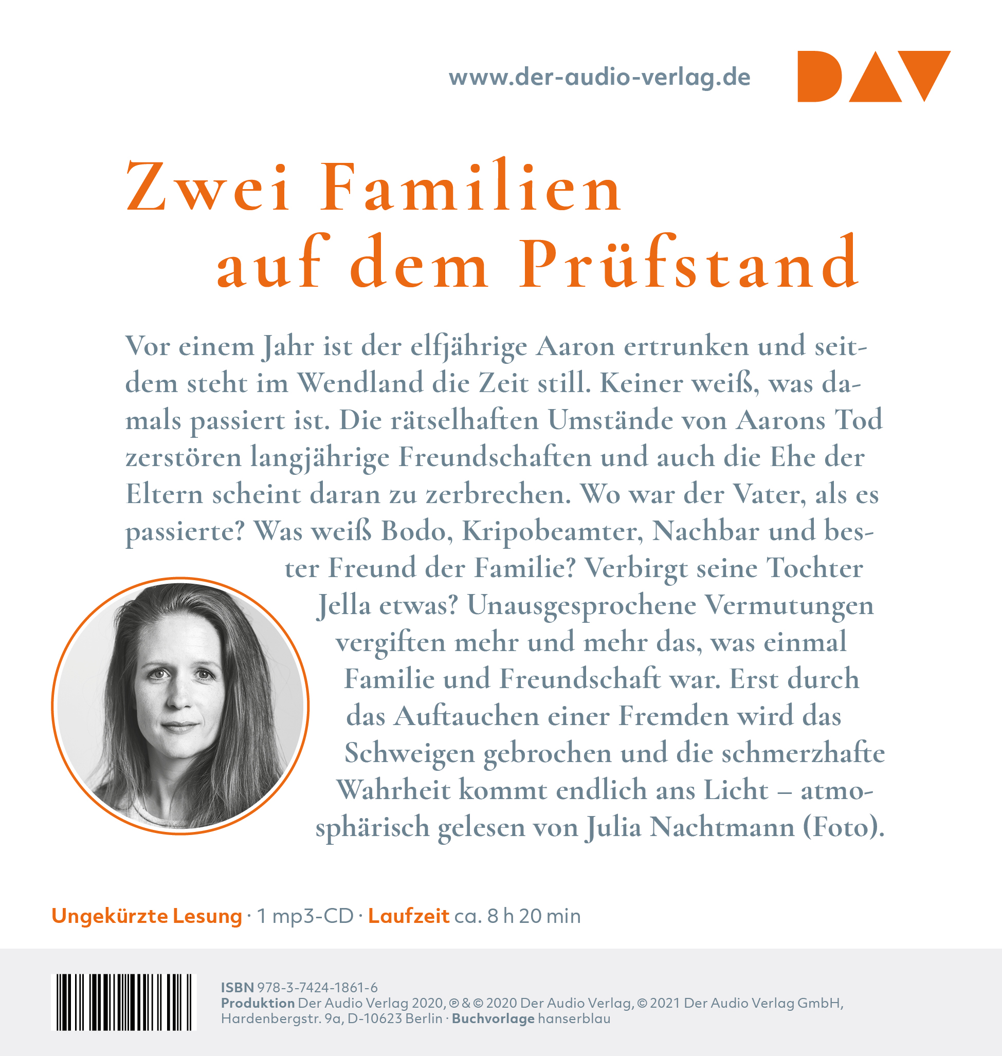 Julia Nachtmann, 1981 geboren, wurde mit dem Boy-Gobert-Preis ausgezeichnet und war in Kinoproduktionen wie »Die Kirche bleibt im Dorf« und Fernsehserien wie »Der Dicke« zu sehen. Sie ist u.a. Sprecherin der Krimi-Bestseller von Nele Neuhaus und liest für DAV alle Hörbücher von Ruth Ware ein.