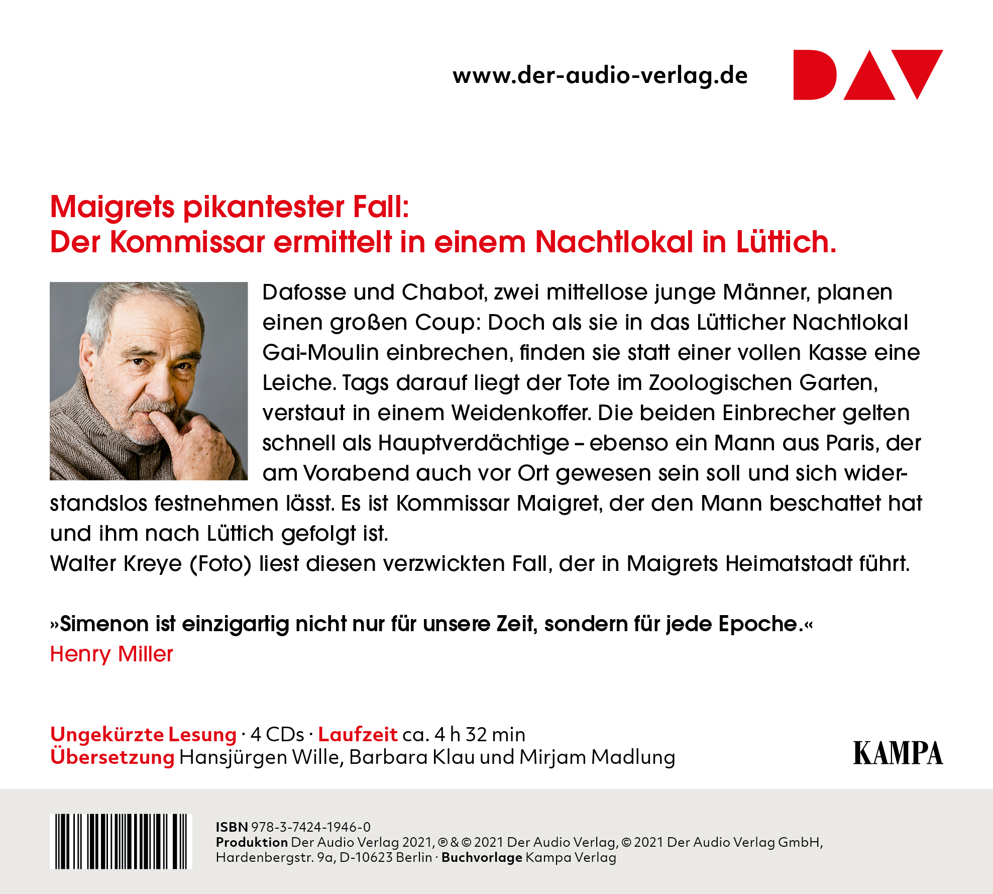 Walter Kreye, geboren 1942, spielte an Bühnen wie dem Hamburger Schauspielhaus, dem Thalia Theater, dem Staatstheater Stuttgart sowie an der Schaubühne Berlin. Der mit dem Grimme-Preis ausgezeichnete Schauspieler wurde durch zahlreiche Film- und Fernsehrollen bekannt, u.a. als Hauptkommissar Kress in »Der Alte« und durch die Netflix-Serie »Dark«. Der beliebte Hörbuchsprecher liest alle Fälle von Kommissar Maigret in der Edition Simenon ein.