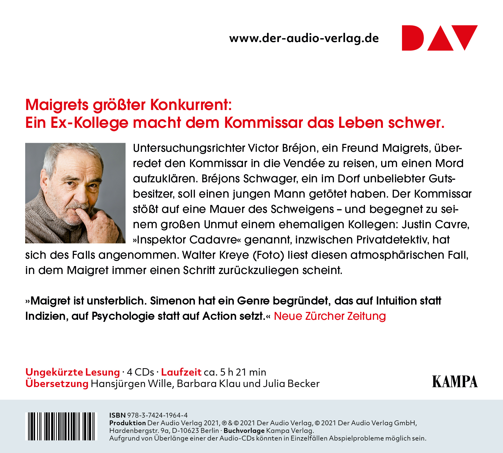 Walter Kreye, geboren 1942, spielte an Bühnen wie dem Hamburger Schauspielhaus, dem Thalia Theater, dem Staatstheater Stuttgart sowie an der Schaubühne Berlin. Der mit dem Grimme-Preis ausgezeichnete Schauspieler wurde durch zahlreiche Film- und Fernsehrollen bekannt, u.a. als Hauptkommissar Kress in »Der Alte« und durch die Netflix-Serie »Dark«. Der beliebte Hörbuchsprecher liest alle Fälle von Kommissar Maigret in der Edition Simenon ein.