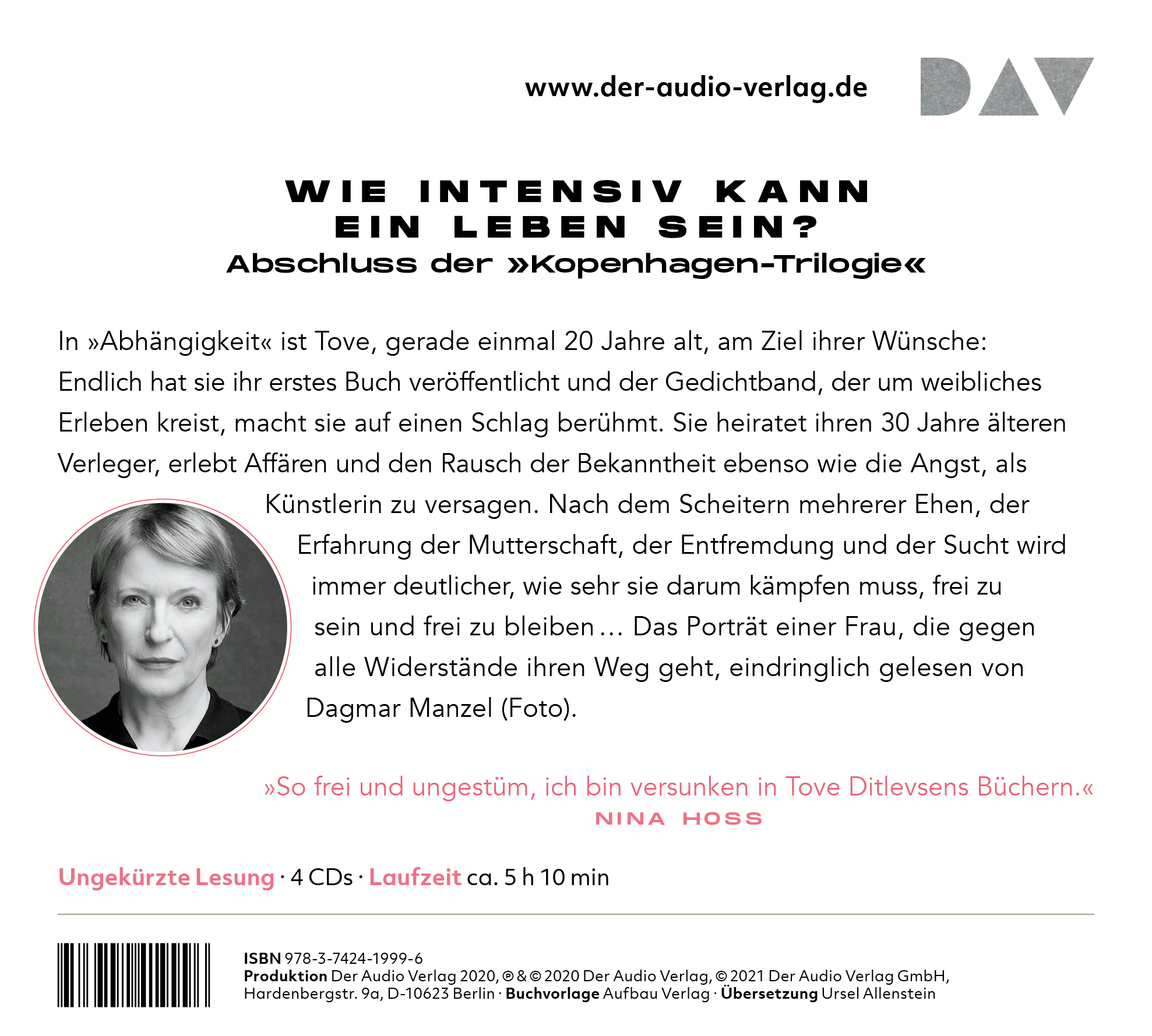 »Abhängigkeit« ist das eindringliche Porträt einer Frau – verletzlich, souverän, eigenständig. Tove Ditlevsens Meisterwerk, die Kopenhagen-Trilogie, wird weltweit als große literarische Wiederentdeckung gefeiert.