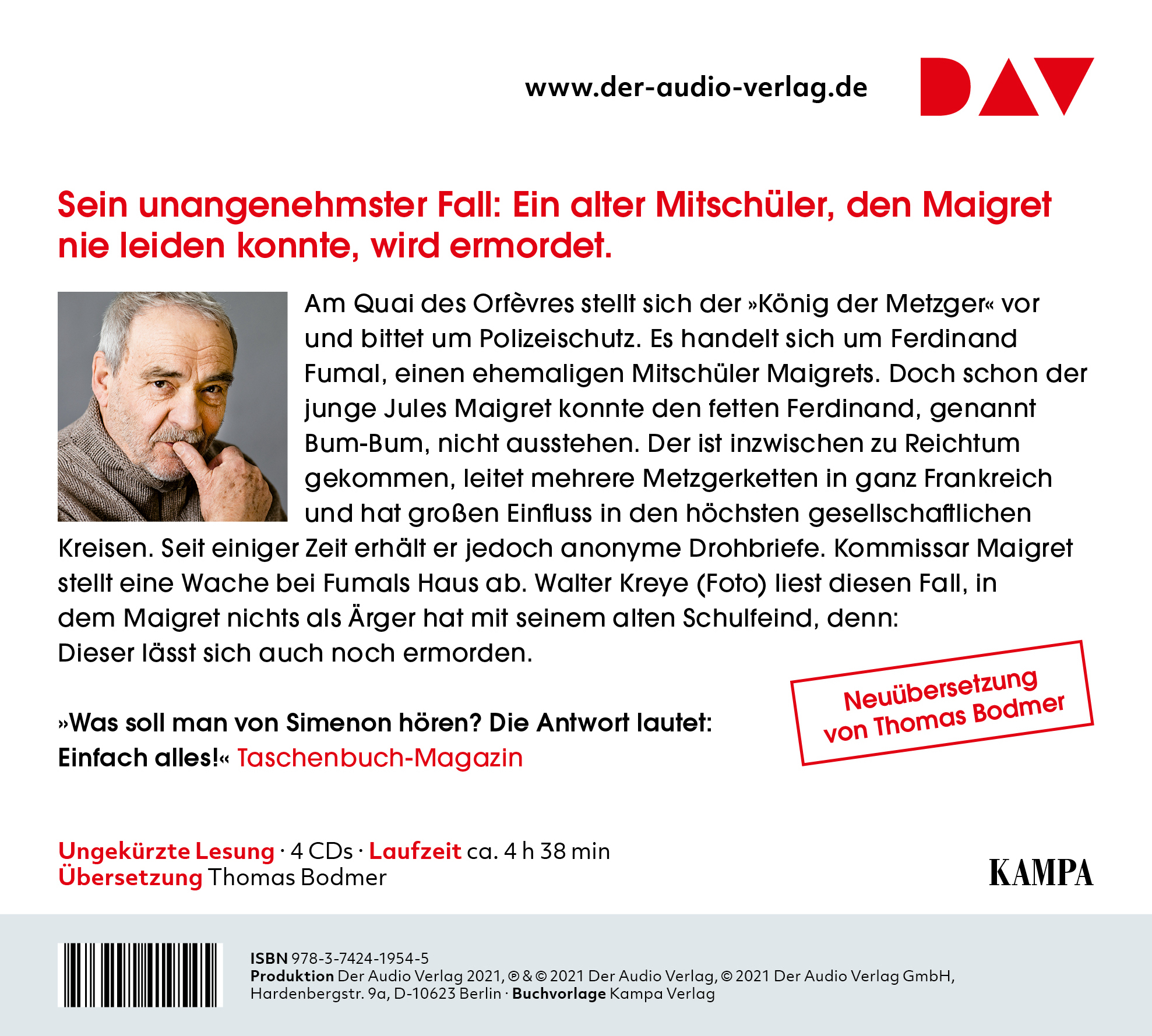 Walter Kreye, geboren 1942, spielte an Bühnen wie dem Hamburger Schauspielhaus, dem Thalia Theater, dem Staatstheater Stuttgart sowie an der Schaubühne Berlin. Der mit dem Grimme-Preis ausgezeichnete Schauspieler wurde durch zahlreiche Film- und Fernsehrollen bekannt, u.a. als Hauptkommissar Kress in »Der Alte« und durch die Netflix-Serie »Dark«. Der beliebte Hörbuchsprecher liest alle Fälle von Kommissar Maigret in der Edition Simenon ein.