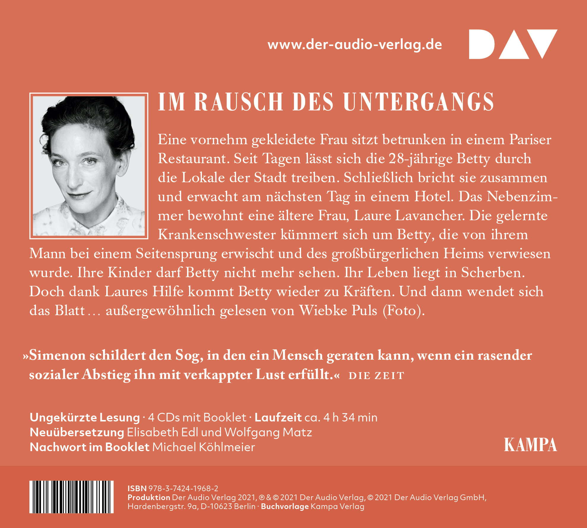 Wiebke Puls, 1973 in Husum geboren, studierte Schauspiel an der Berliner Hochschule der Künste und ist seit 2005 Ensemblemitglied an den Münchner Kammerspielen. Sie wurde mit zahlreichen Preisen ausgezeichnet, u.a. war sie für den Deutschen Hörbuchpreis nominiert. Für DAV hat sie zuletzt »Feuer der Freiheit« von Wolfram Eilenberger eingelesen.