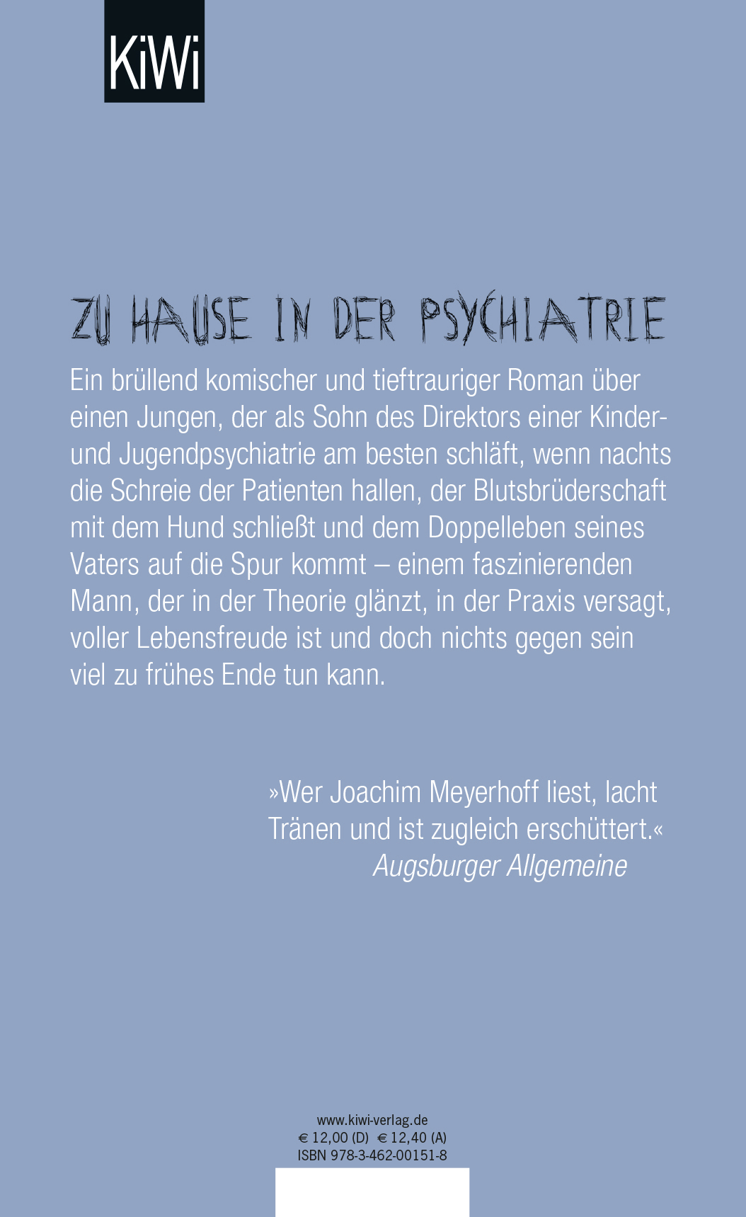 Der junge Held in Meyerhoffs zweitem Roman wächst zwischen Hunderten von Verrückten als jüngster Sohn des Direktors einer Kinder- und Jugendpsychiatrie auf – und mag es sogar sehr. Mit zwei Brüdern und einer Mutter, die den Alltag stemmt – und einem Vater, der in der Theorie glänzt, in der Praxis aber stets versagt. Wer schafft es sonst, den Vorsatz, sich mehr zu bewegen, gleich mit einer Bänderdehnung zu bezahlen und die teuren Laufschuhe nie wieder anzuziehen? Oder bei Flaute mit dem Segelboot in Seenot zu geraten und vorher noch den Sohn über Bord zu werfen?