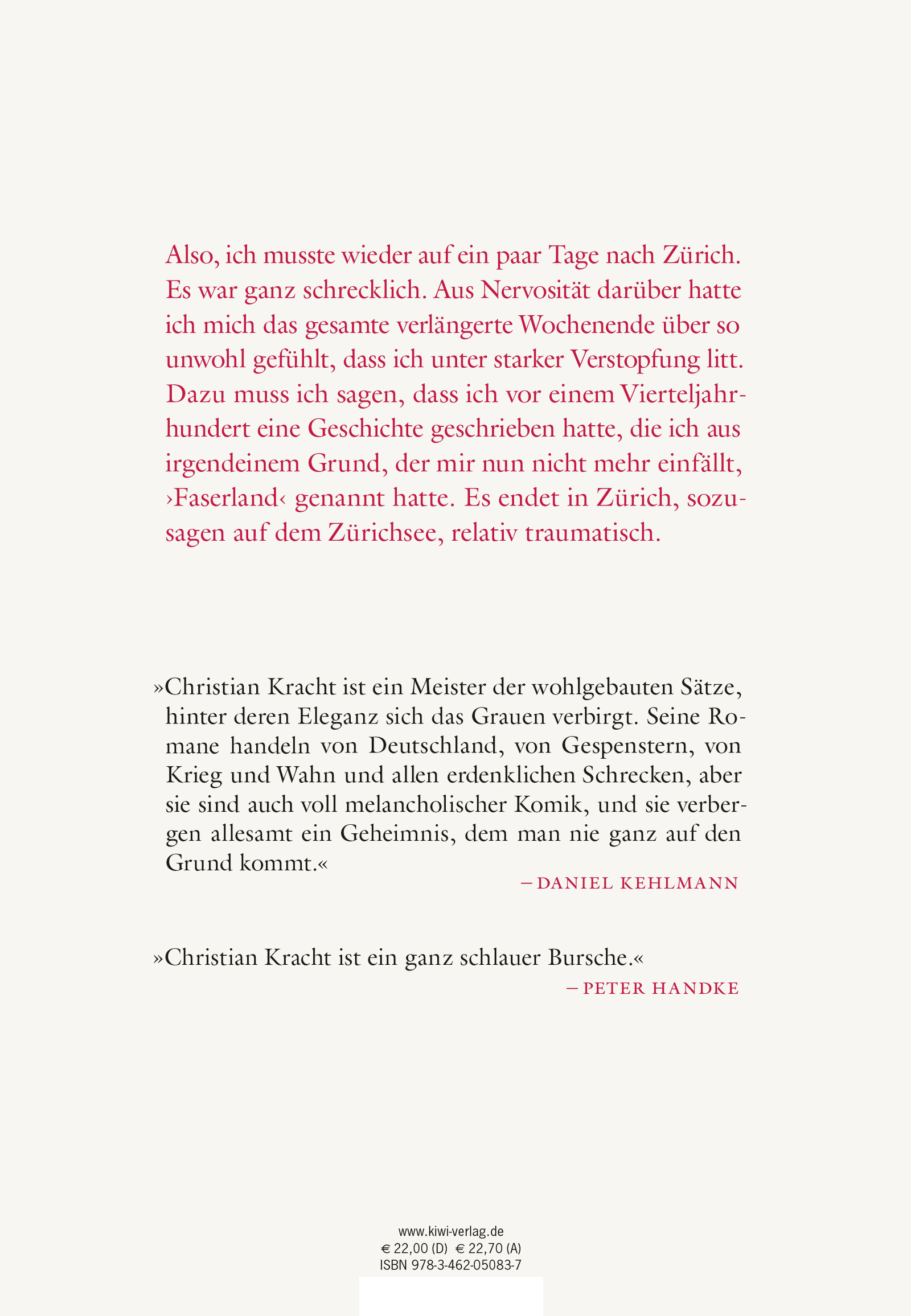 »I’ll see you in twenty-five years.« Laura Palmer. »Also, ich musste wieder auf ein paar Tage nach Zürich. Es war ganz schrecklich. Aus Nervosität darüber hatte ich mich das gesamte verlängerte Wochenende über so unwohl gefühlt, dass ich unter starker Verstopfung litt. Dazu muss ich sagen, dass ich vor einem Vierteljahrhundert eine Geschichte geschrieben hatte, die ich aus irgendeinem Grund, der mir nun nicht mehr einfällt, ›Faserland‹ genannt hatte. Es endet in Zürich, sozusagen auf dem Zürichsee, relativ traumatisch.«
