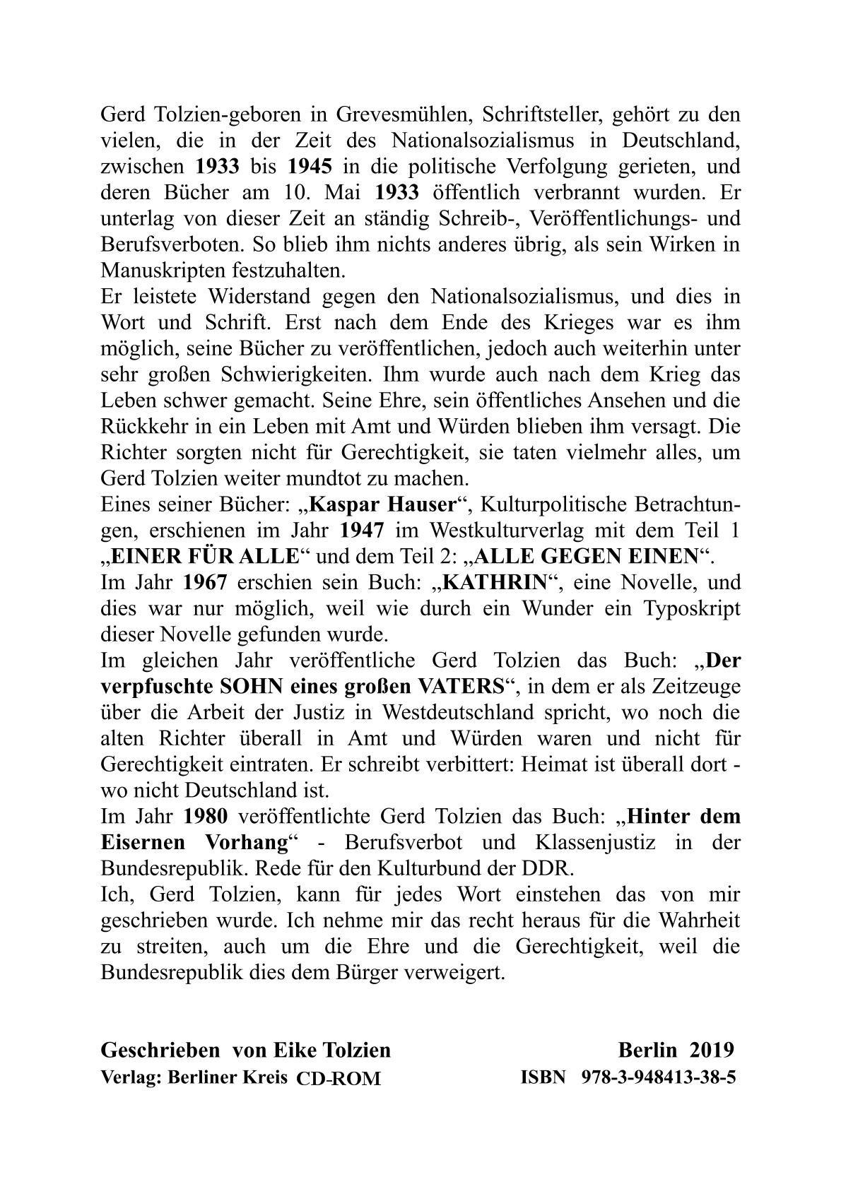 Im gleichen Jahr veröffentliche Gerd Tolzien das Buch: „Der verpfuschte SOHN eines großen VATERS“, in dem er als Zeitzeuge über die Arbeit der Justiz in Westdeutschland spricht, wo noch die alten Richter überall in Amt und Würden waren und nicht für Gerechtigkeit eintraten. Er schreibt verbittert: Heimat ist überall dort - wo nicht Deutschland ist.