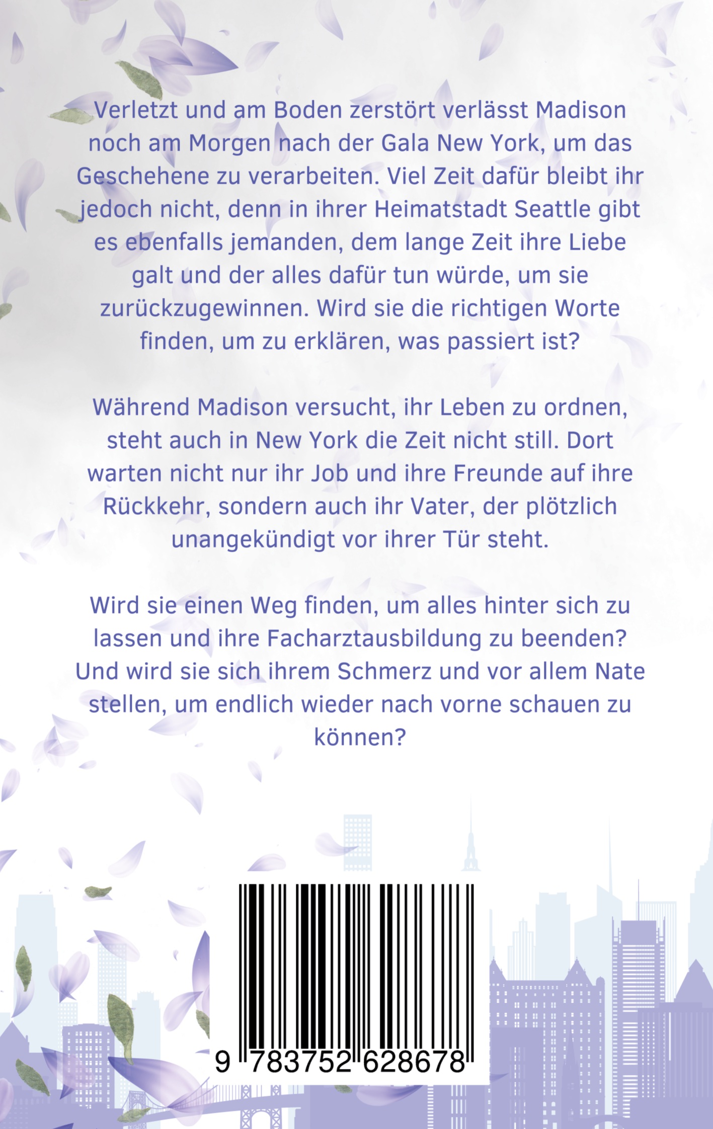 Verletzt und am Boden zerstört verlässt Madison noch am Morgen nach der Gala New York, um das Geschehene zu verarbeiten. Viel Zeit dafür bleibt jedoch nicht, denn in ihrer Heimatstadt Seattle gibt es ebenfalls jemanden, dem lange Zeit ihre Liebe galt und der alles dafür tun würde, um sie zurückzugewinnen. Wird sie die richtigen Worte finden, um zu erklären, was passiert ist?Während Madison versucht, ihr Leben zu ordnen, geht auch in New York das Leben weiter. Dort warten nicht nur ihr Job und ihre Freunde auf ihre Rückkehr, sondern auch ihr Vater, der plötzlich unangekündigt vor ihrer Tür steht. Wird sie einen Weg finden, alles hinter sich zu lassen und ihre Facharztausbildung beenden? Und wird sie sich ihrem Schmerz und vor allem Nate stellen, um endlich wieder nach vorne schauen zu können?Triggerwarnung:Gewalt, vulgäre Aussprache, explizite Sexszenen und toxische Beziehungen werden in diesem Buch angeschnitten. Nur Leser, die solche Themen verarbeiten können, sollten dieses Werk lesen.